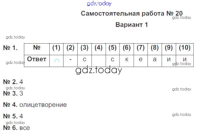 На страницах сайта gdz.today вы найдете учебный и вспомогательный материал, направленный на улучшения знаний школьной программы. ГДЗ - онлайн мир знаний СР-20 Решение к самостоятельным работам вариант-1 Тематическому контролю по Русскому языку для 6 класса Александров, Александрова Национальное образование 2017