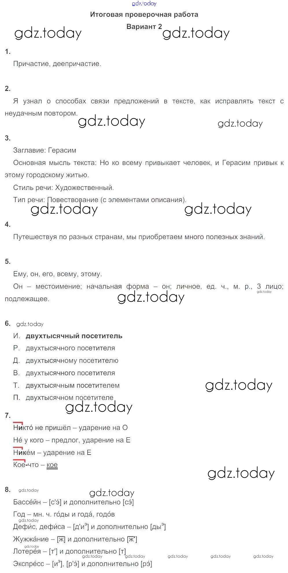 На страницах сайта gdz.today вы найдете учебный и вспомогательный материал, направленный на улучшения знаний школьной программы. ГДЗ - онлайн мир знаний Решение к итоговой проверочной работе Вариант-2 Тетради для оценки качества знаний по Русскому языку для 6 класса Львов Дрофа Вертикаль 2015
