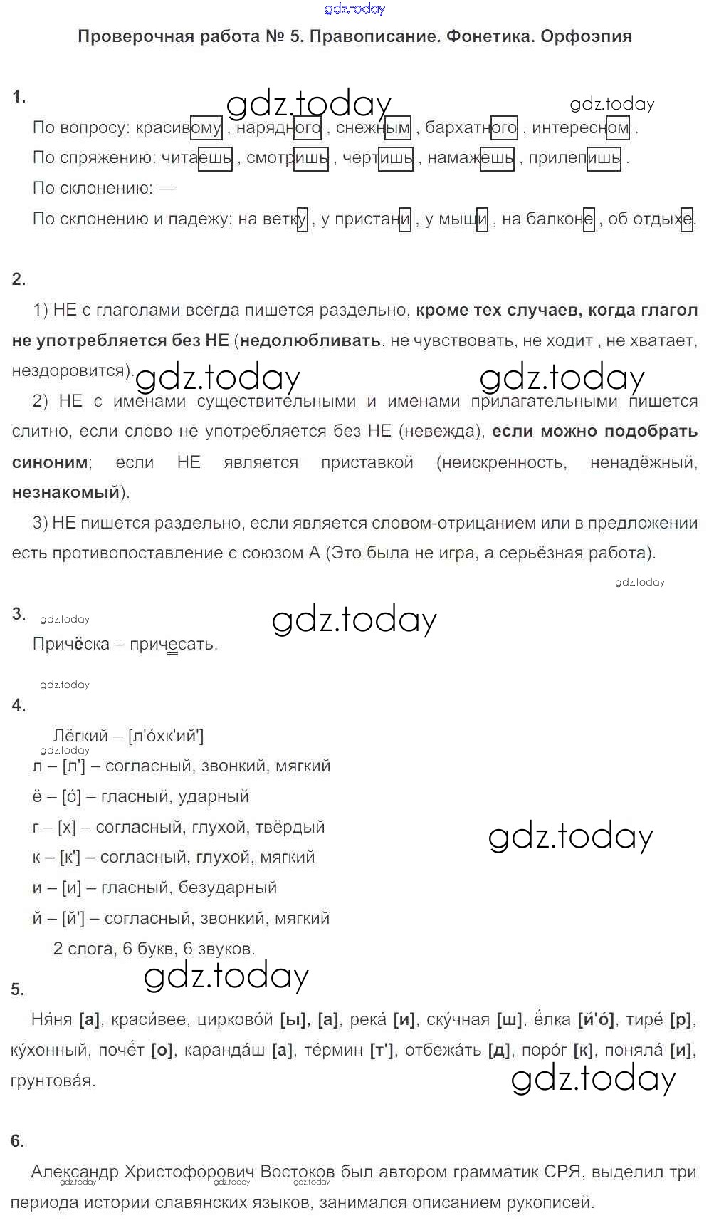 На страницах сайта gdz.today вы найдете учебный и вспомогательный материал, направленный на улучшения знаний школьной программы. ГДЗ - онлайн мир знаний Решение к проверочным работам ПР №5. Правописание. Фонетика. Орфоэпия Тетради для оценки качества знаний по Русскому языку для 6 класса Львов Дрофа Вертикаль 2015
