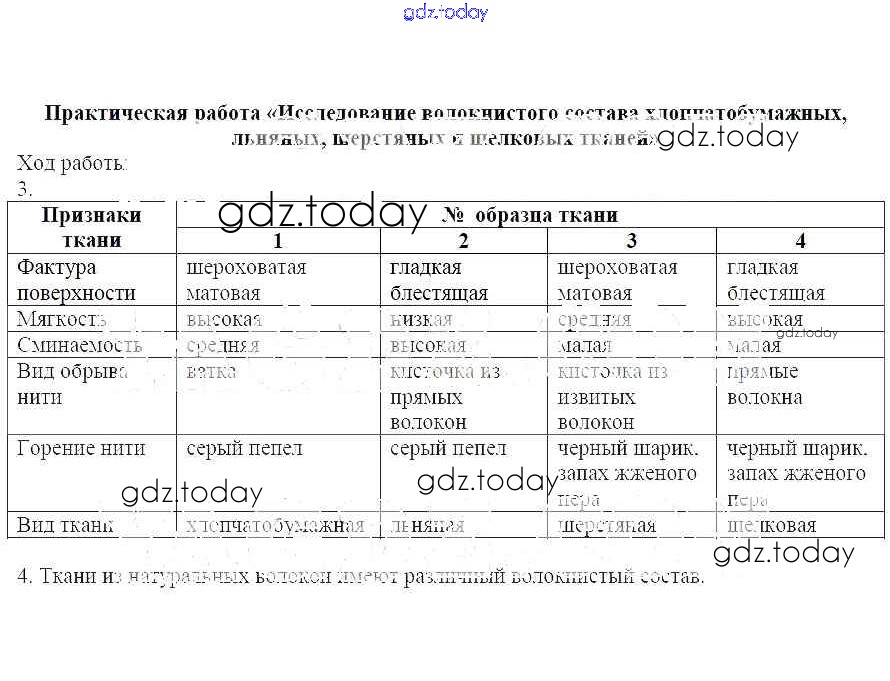 На страницах сайта gdz.today вы найдете учебный и вспомогательный материал, направленный на улучшения знаний школьной программы. ГДЗ - онлайн мир знаний Решение к теме "Материаловедение" Практическая работа - Исследование волокнистого состава хлопчатобумажных, льняных, шерстяных и шелковых тканей Рабочей тетради по Технологии для 6 класса Кожина, Маркуцкая Дрофа 2019
