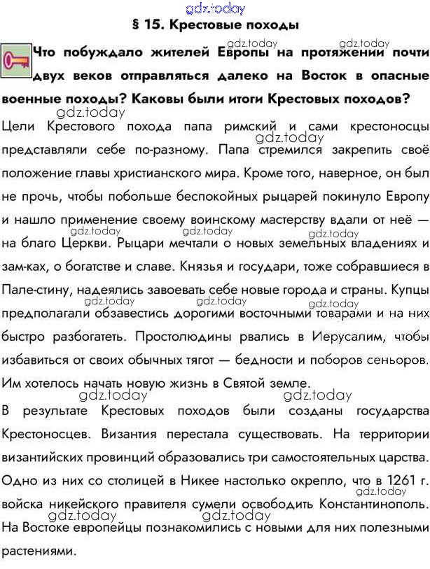 На страницах сайта gdz.today вы найдете учебный и вспомогательный материал, направленный на улучшения знаний школьной программы. ГДЗ - онлайн мир знаний Ключевые вопросы Решение к §15 1 Учебнику по Всеобщей истории для 6 класса Бойцов, Шукуров Русское слово Инновационная школа 2019
