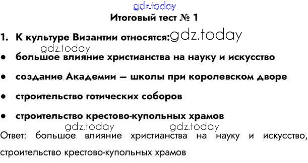 На страницах сайта gdz.today вы найдете учебный и вспомогательный материал, направленный на улучшения знаний школьной программы. ГДЗ - онлайн мир знаний Тест №1 Итоговый тест 1 Учебнику по Всеобщей истории для 6 класса Бойцов, Шукуров Русское слово Инновационная школа 2019