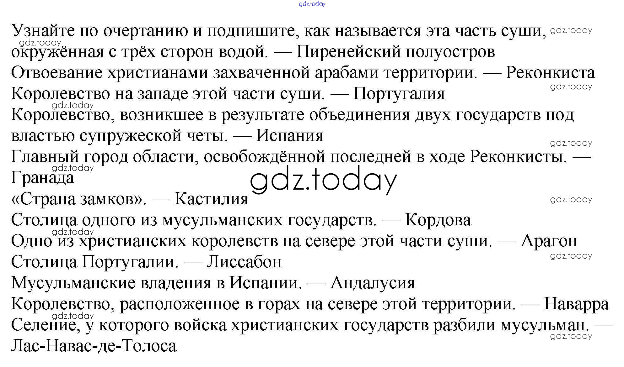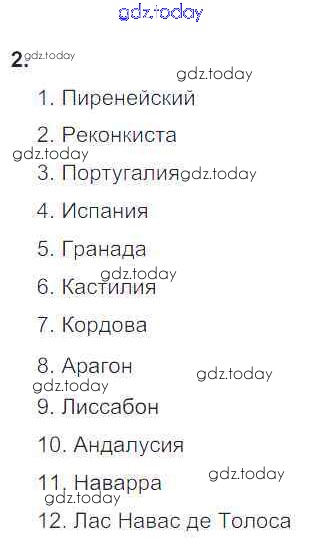 На страницах сайта gdz.today вы найдете учебный и вспомогательный материал, направленный на улучшения знаний школьной программы. ГДЗ - онлайн мир знаний Решение к § 22 «Реконкиста и образование централизованных государств на Пиренейском полуострове» 2 Рабочей тетради по Всеобщей истории для 6 класса Крючкова Просвещение 2015