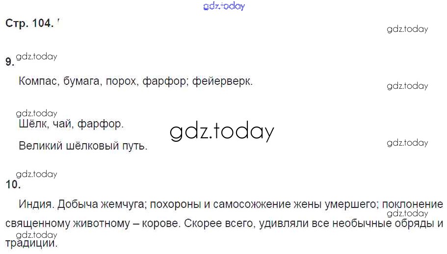 На страницах сайта gdz.today вы найдете учебный и вспомогательный материал, направленный на улучшения знаний школьной программы. ГДЗ - онлайн мир знаний Решение к главе 9. Где был и и где не был Марко Поло стр. 104 Рабочей тетради по Всеобщей истории для 6 класса Петрова Русское слово Инновационная школа 2017
