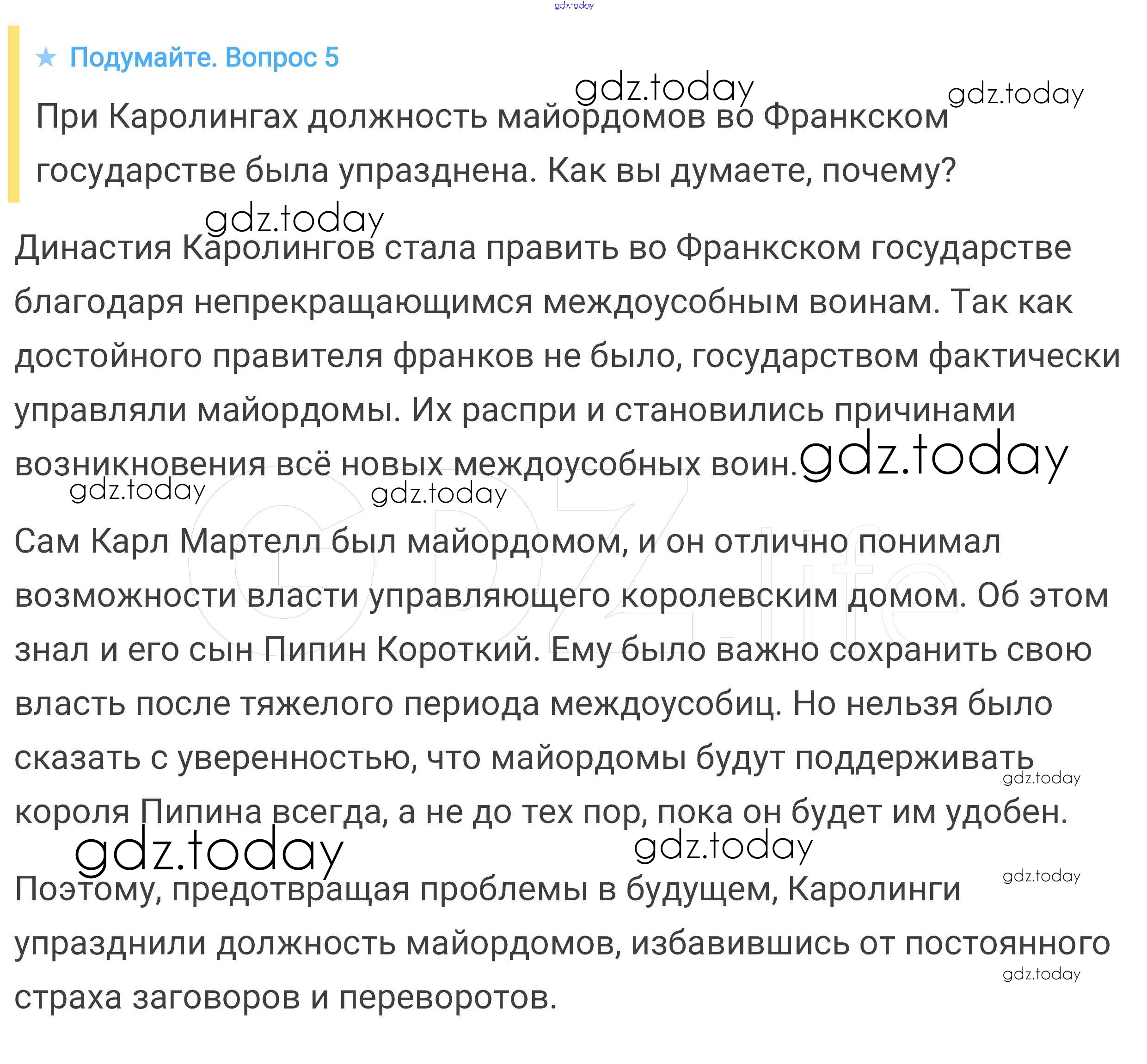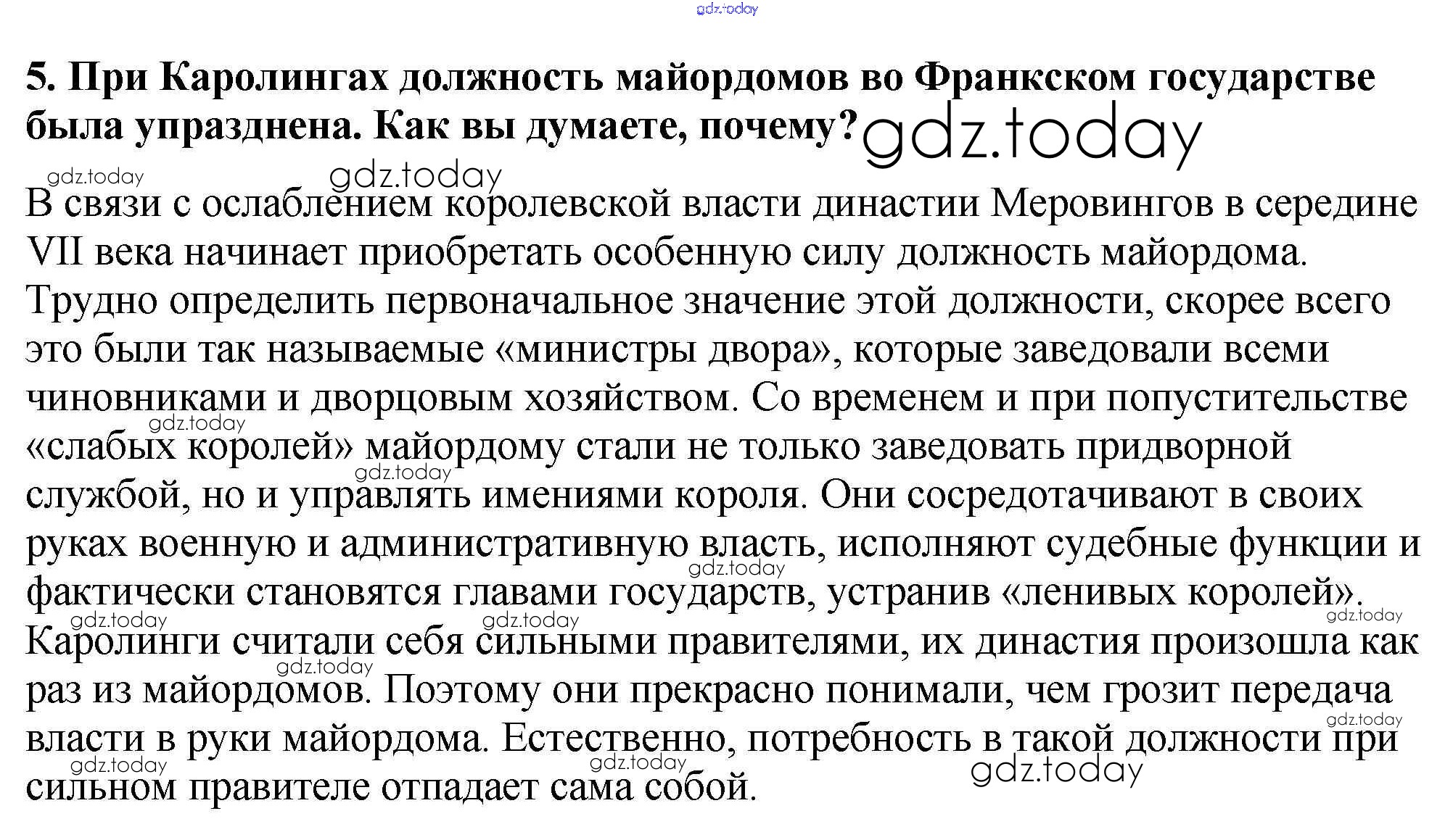 На страницах сайта gdz.today вы найдете учебный и вспомогательный материал, направленный на улучшения знаний школьной программы. ГДЗ - онлайн мир знаний Подумайте § 1. Образование варварских королевств. Государство франков в VI-VIII веках 5 Учебнику по Всеобщей истории для 6 класса Агибалова, Донской Просвещение 2014