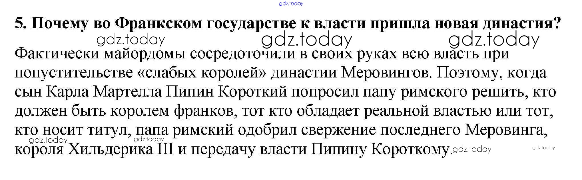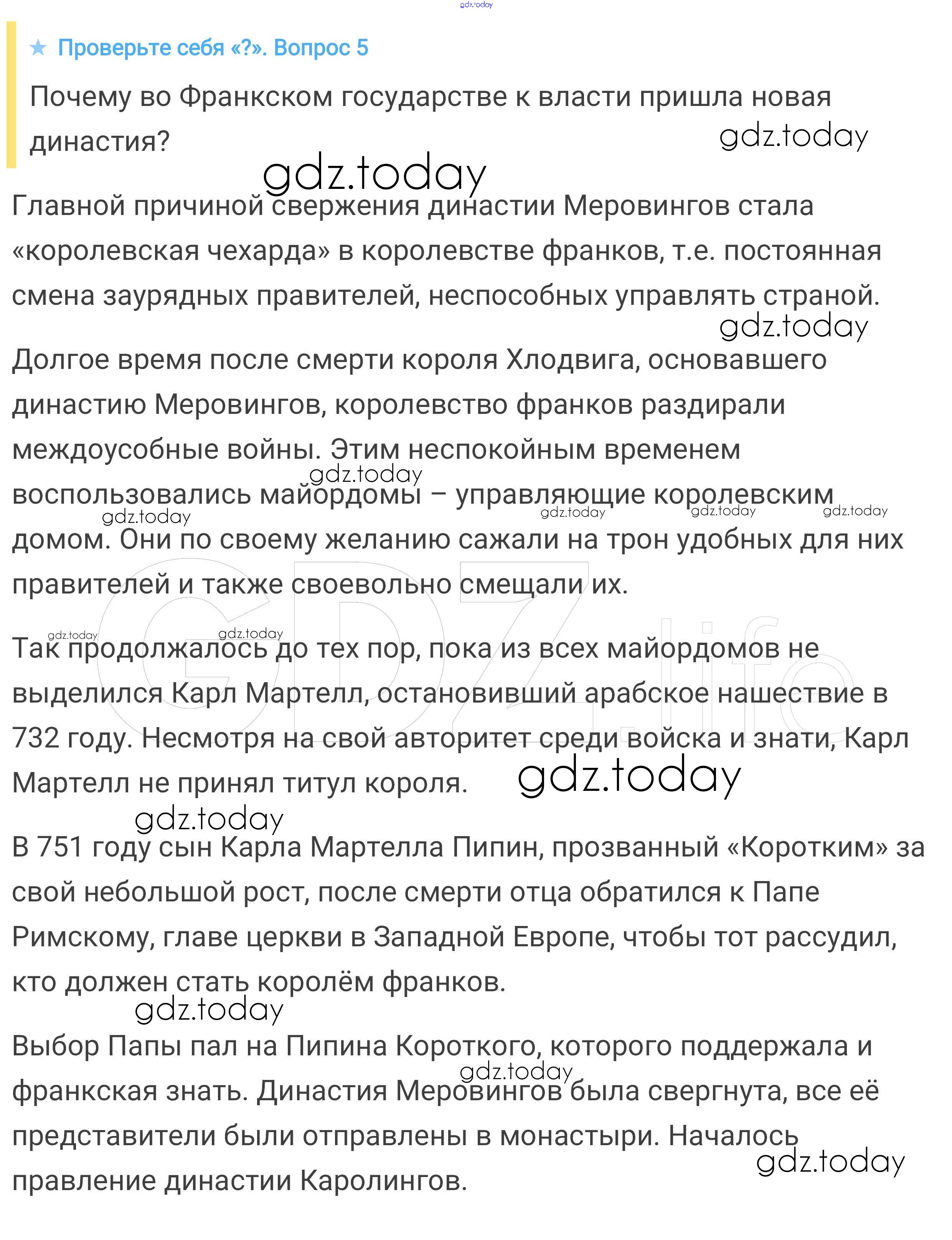 На страницах сайта gdz.today вы найдете учебный и вспомогательный материал, направленный на улучшения знаний школьной программы. ГДЗ - онлайн мир знаний Проверьте себя § 1. Образование варварских королевств. Государство франков в VI-VIII веках 5 Учебнику по Всеобщей истории для 6 класса Агибалова, Донской Просвещение 2014