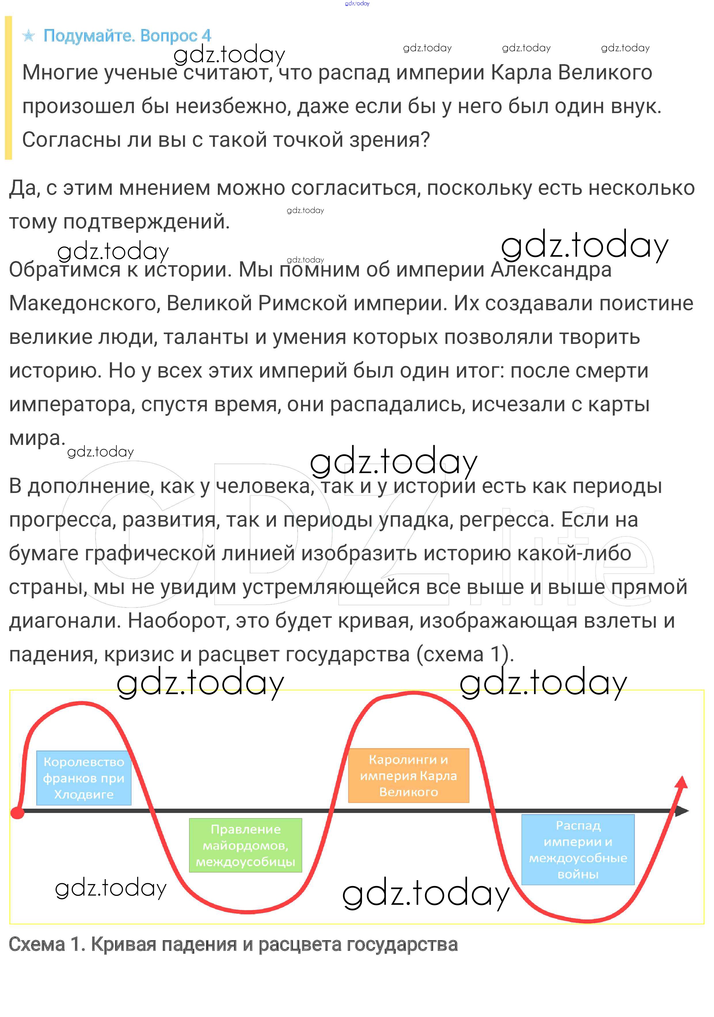 На страницах сайта gdz.today вы найдете учебный и вспомогательный материал, направленный на улучшения знаний школьной программы. ГДЗ - онлайн мир знаний Подумайте § 3. Возникновение и распад империи Карла Великого 4 Учебнику по Всеобщей истории для 6 класса Агибалова, Донской Просвещение 2014