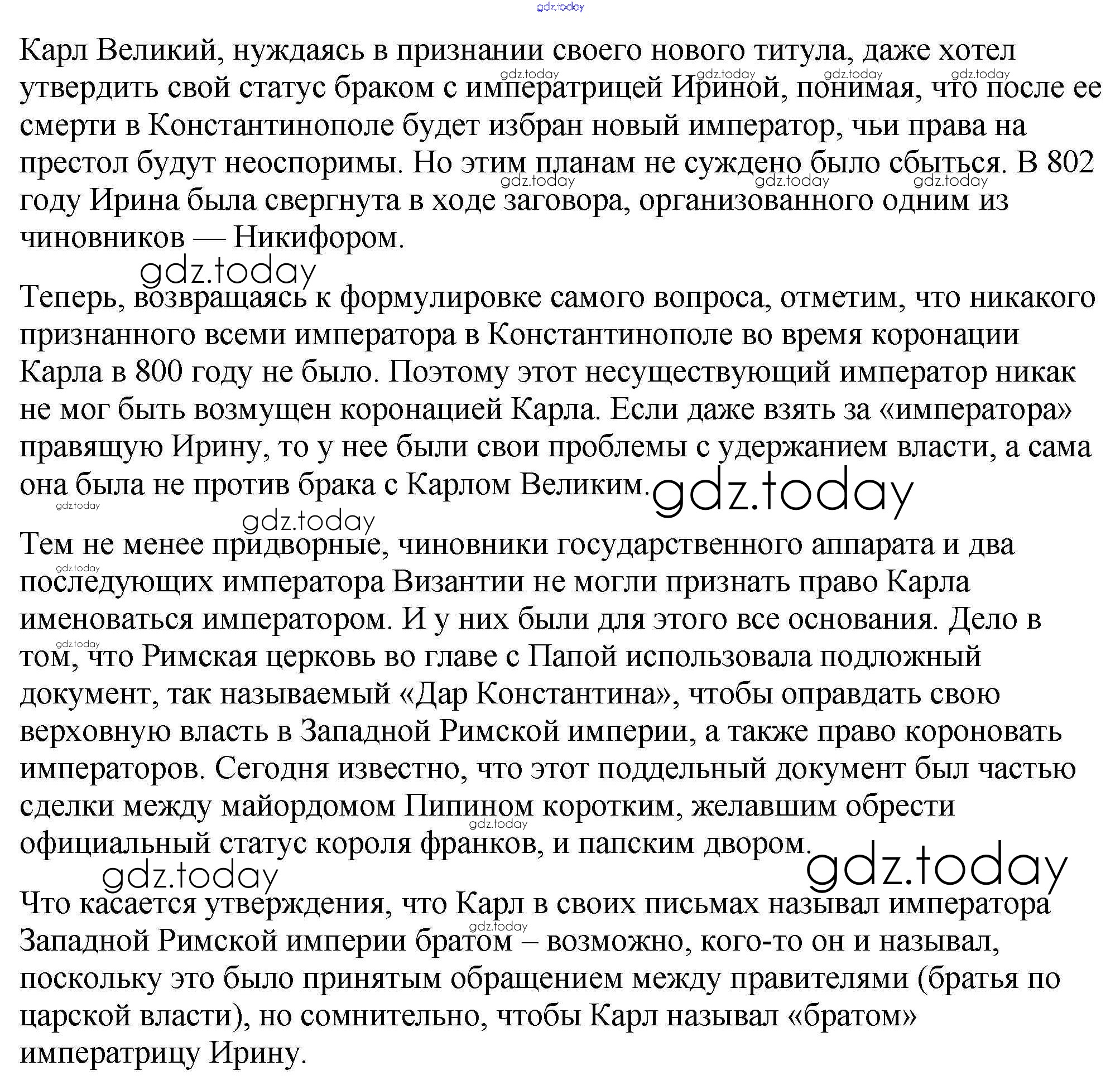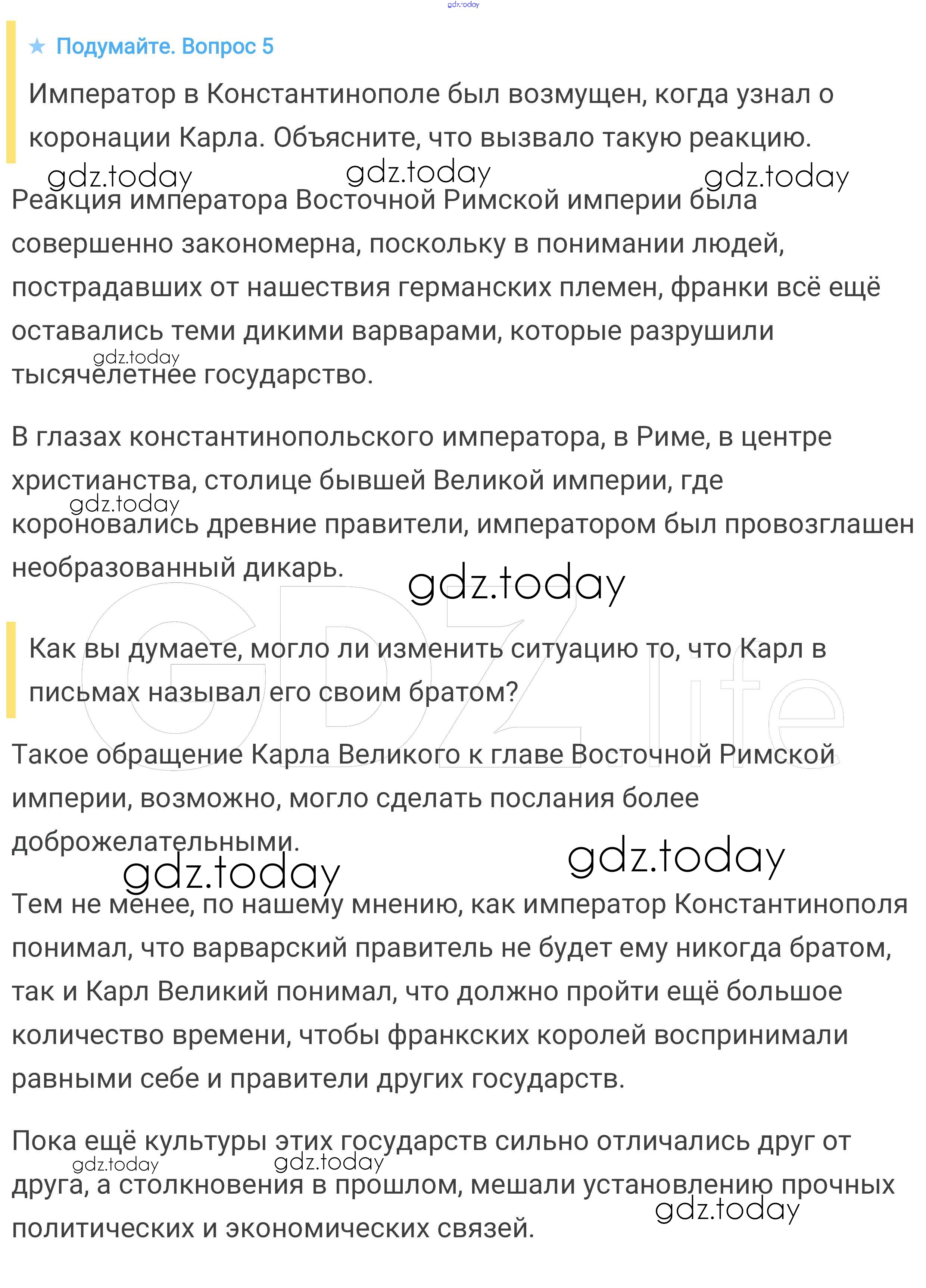 На страницах сайта gdz.today вы найдете учебный и вспомогательный материал, направленный на улучшения знаний школьной программы. ГДЗ - онлайн мир знаний Подумайте § 3. Возникновение и распад империи Карла Великого 5 Учебнику по Всеобщей истории для 6 класса Агибалова, Донской Просвещение 2014