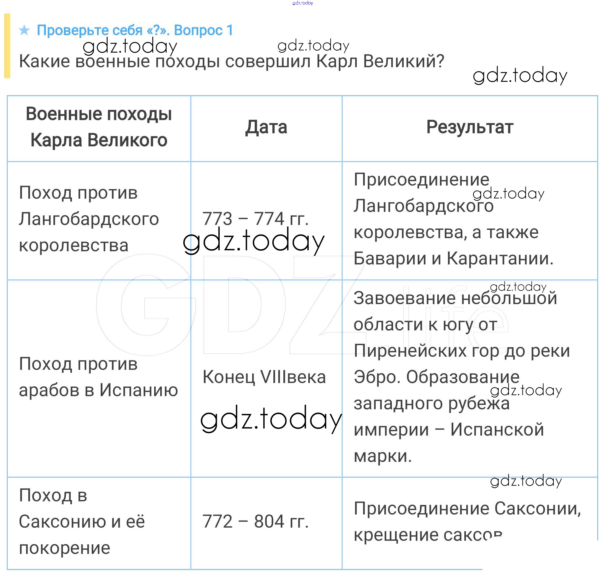 На страницах сайта gdz.today вы найдете учебный и вспомогательный материал, направленный на улучшения знаний школьной программы. ГДЗ - онлайн мир знаний Проверьте себя § 3. Возникновение и распад империи Карла Великого 1 Учебнику по Всеобщей истории для 6 класса Агибалова, Донской Просвещение 2014