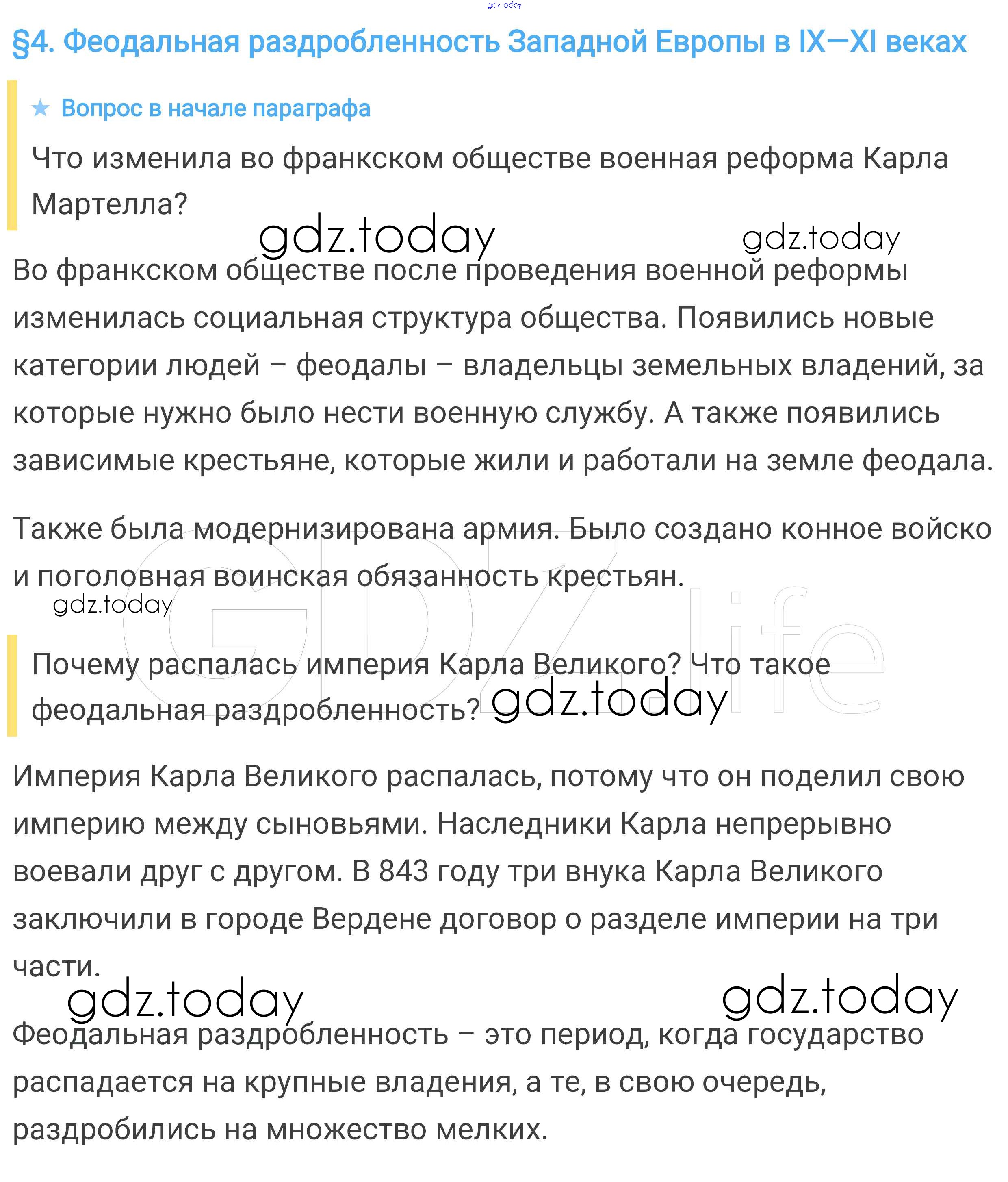 На страницах сайта gdz.today вы найдете учебный и вспомогательный материал, направленный на улучшения знаний школьной программы. ГДЗ - онлайн мир знаний Вопросы в начале параграфа § 4. Феодальная раздробленность в Западной Европы в IX-XI веках 1 Учебнику по Всеобщей истории для 6 класса Агибалова, Донской Просвещение 2014
