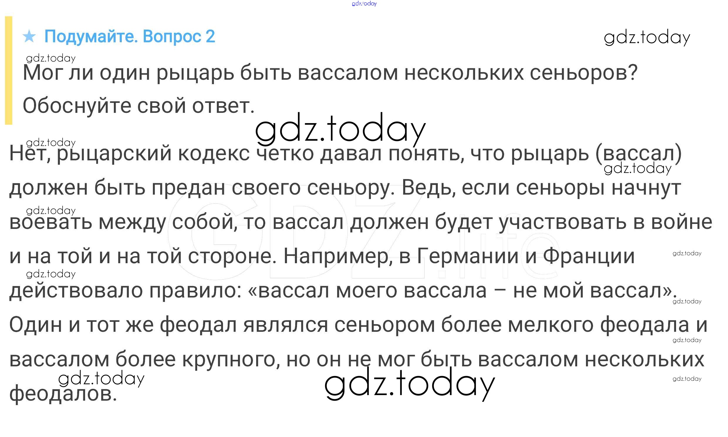 На страницах сайта gdz.today вы найдете учебный и вспомогательный материал, направленный на улучшения знаний школьной программы. ГДЗ - онлайн мир знаний Подумайте § 4. Феодальная раздробленность в Западной Европы в IX-XI веках 2 Учебнику по Всеобщей истории для 6 класса Агибалова, Донской Просвещение 2014