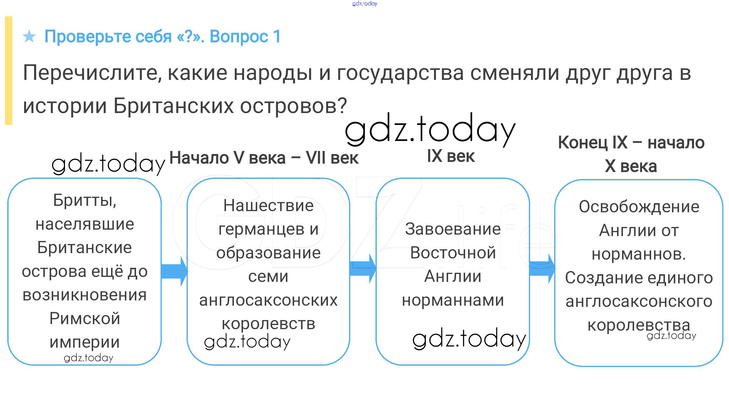 На страницах сайта gdz.today вы найдете учебный и вспомогательный материал, направленный на улучшения знаний школьной программы. ГДЗ - онлайн мир знаний Проверьте себя § 5. Англия в раннее Средневековье 1 Учебнику по Всеобщей истории для 6 класса Агибалова, Донской Просвещение 2014