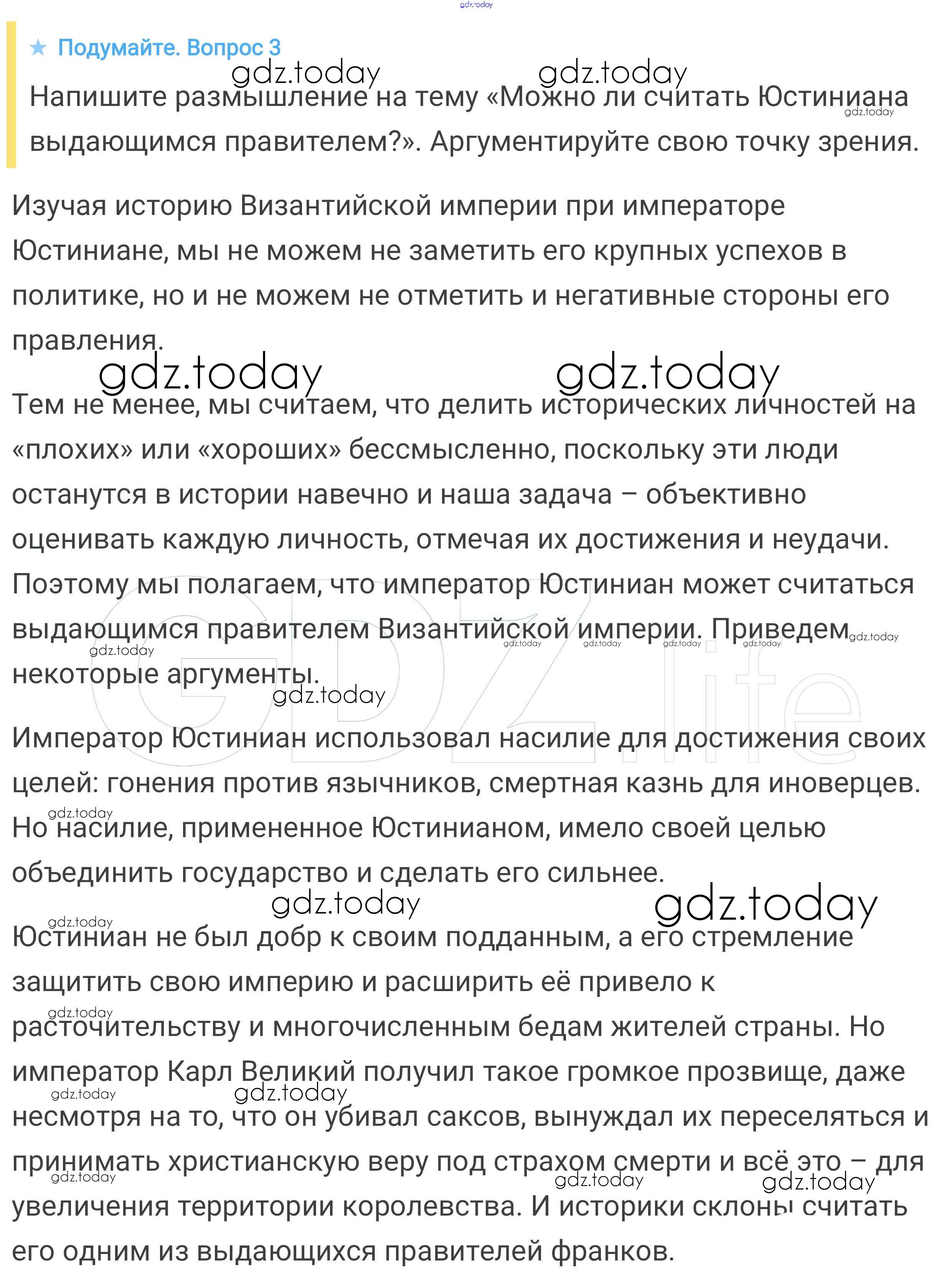 На страницах сайта gdz.today вы найдете учебный и вспомогательный материал, направленный на улучшения знаний школьной программы. ГДЗ - онлайн мир знаний Подумайте § 6. Византия при Юстиниане. Борьба империи с внешними врагами 3 Учебнику по Всеобщей истории для 6 класса Агибалова, Донской Просвещение 2014