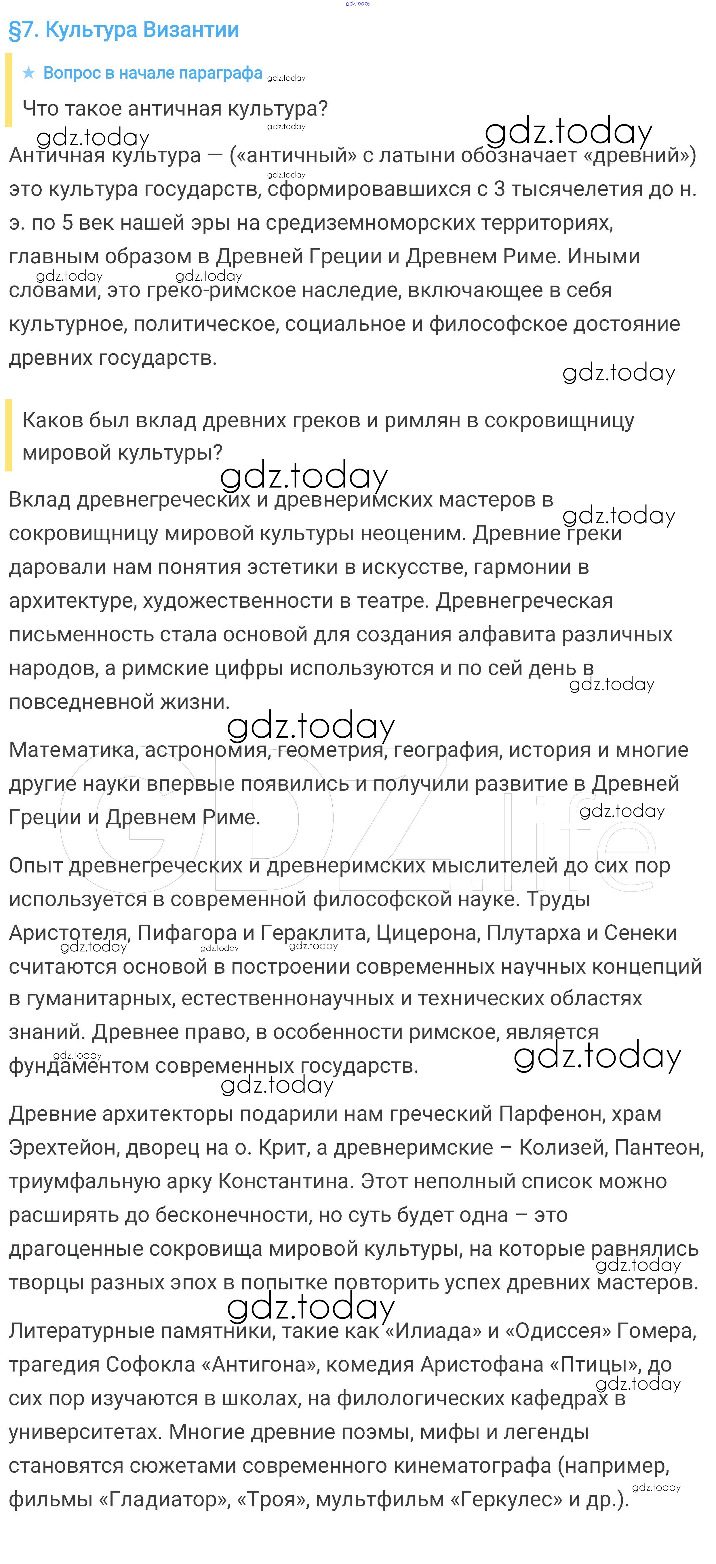 На страницах сайта gdz.today вы найдете учебный и вспомогательный материал, направленный на улучшения знаний школьной программы. ГДЗ - онлайн мир знаний Вопросы в начале параграфа § 7. Культура Византии 1 Учебнику по Всеобщей истории для 6 класса Агибалова, Донской Просвещение 2014