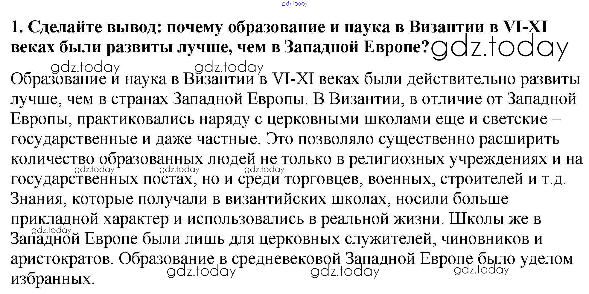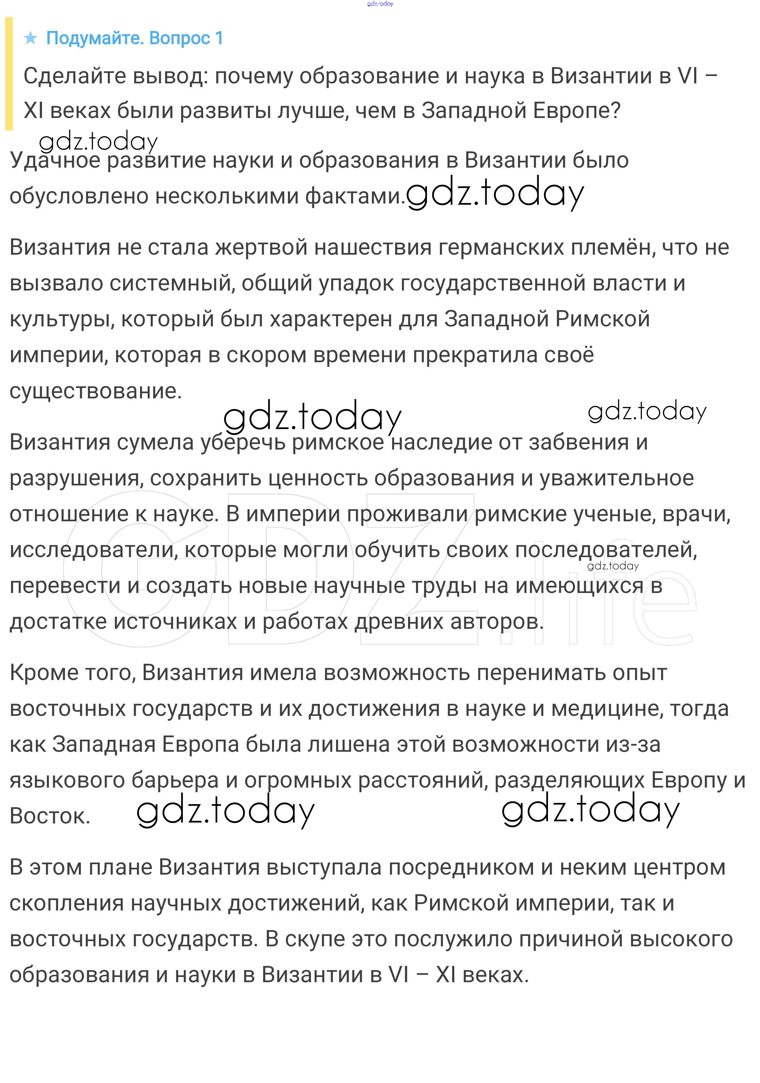 На страницах сайта gdz.today вы найдете учебный и вспомогательный материал, направленный на улучшения знаний школьной программы. ГДЗ - онлайн мир знаний Подумайте § 7. Культура Византии 1 Учебнику по Всеобщей истории для 6 класса Агибалова, Донской Просвещение 2014