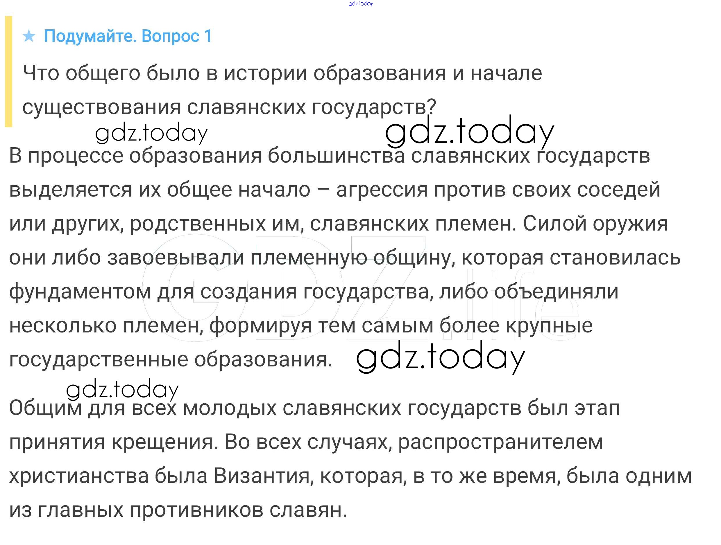 На страницах сайта gdz.today вы найдете учебный и вспомогательный материал, направленный на улучшения знаний школьной программы. ГДЗ - онлайн мир знаний Подумайте § 8. Образование славянских государств 1 Учебнику по Всеобщей истории для 6 класса Агибалова, Донской Просвещение 2014