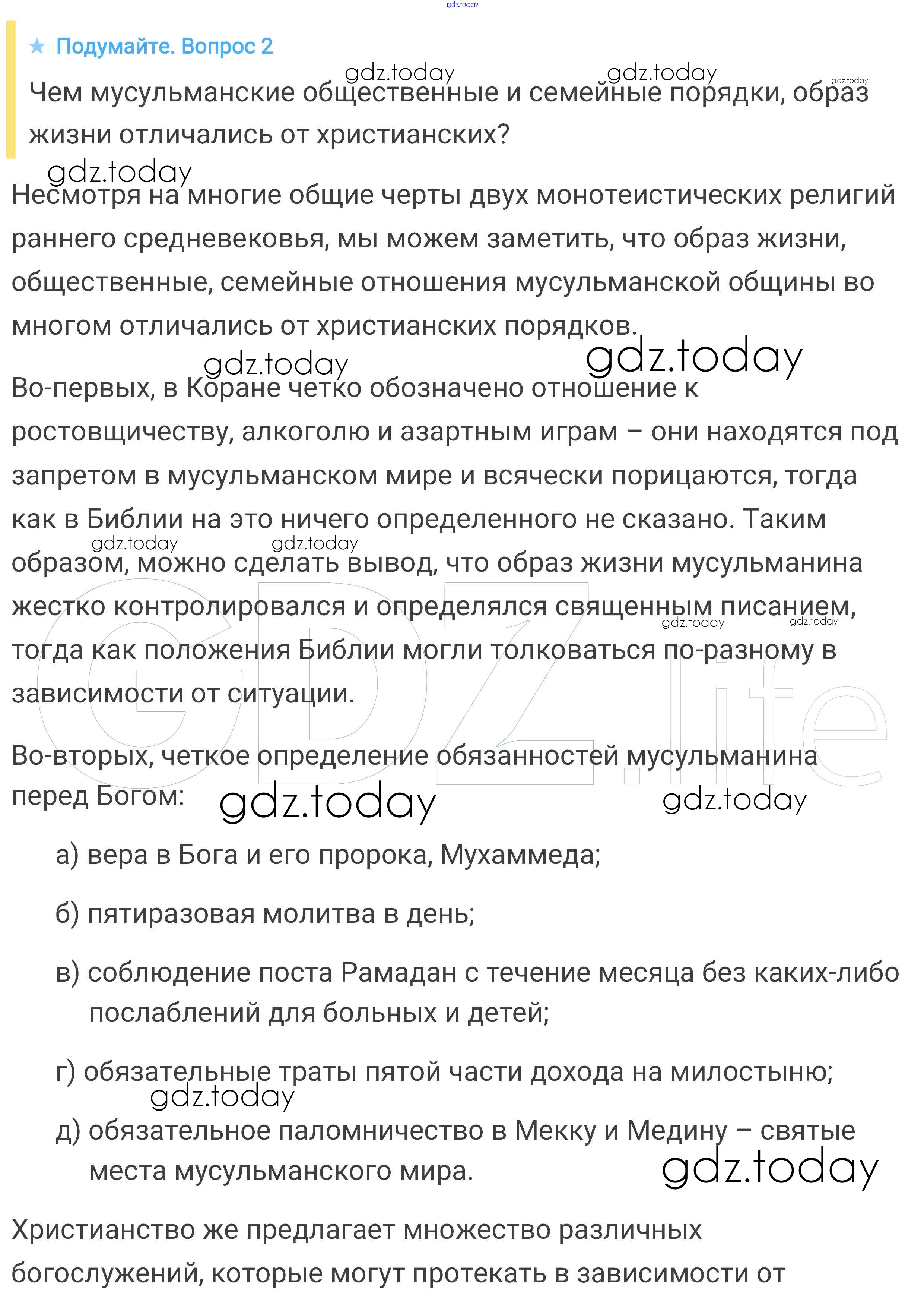 На страницах сайта gdz.today вы найдете учебный и вспомогательный материал, направленный на улучшения знаний школьной программы. ГДЗ - онлайн мир знаний Подумайте § 9. Возникновение ислама. Арабский халифат и его распад 2 Учебнику по Всеобщей истории для 6 класса Агибалова, Донской Просвещение 2014