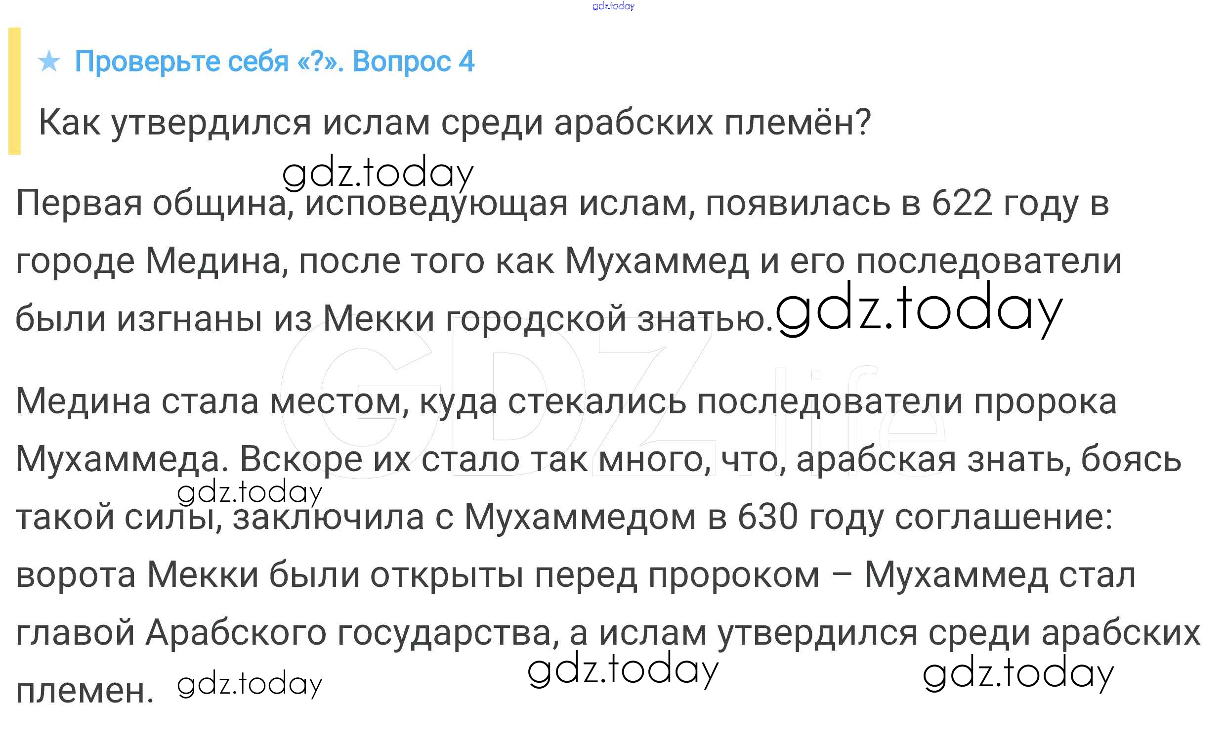 На страницах сайта gdz.today вы найдете учебный и вспомогательный материал, направленный на улучшения знаний школьной программы. ГДЗ - онлайн мир знаний Проверьте себя § 9. Возникновение ислама. Арабский халифат и его распад 4 Учебнику по Всеобщей истории для 6 класса Агибалова, Донской Просвещение 2014