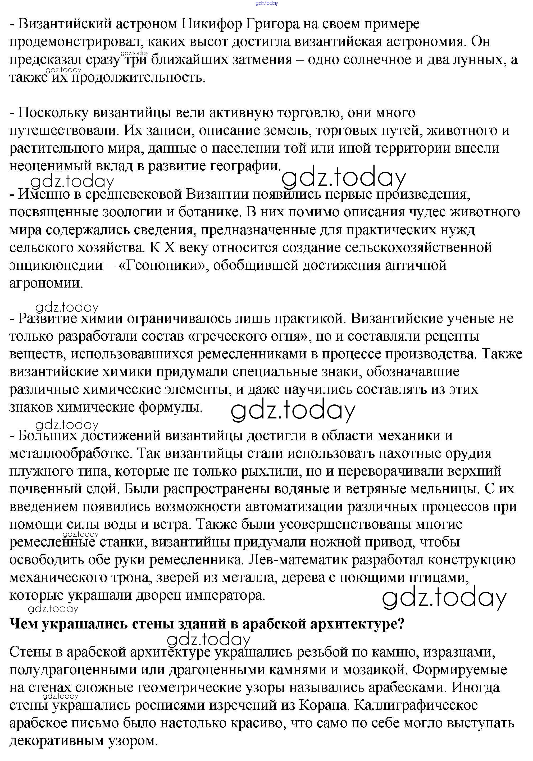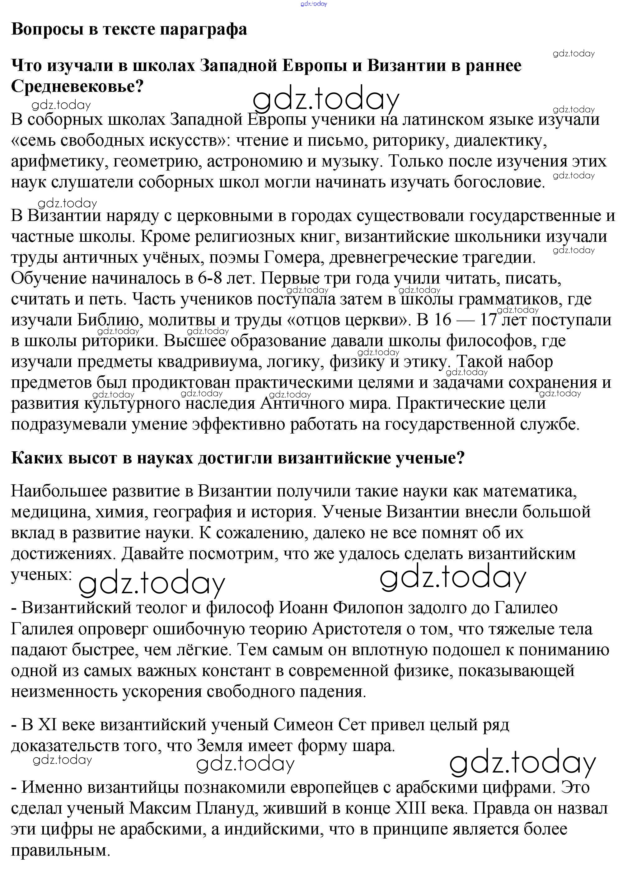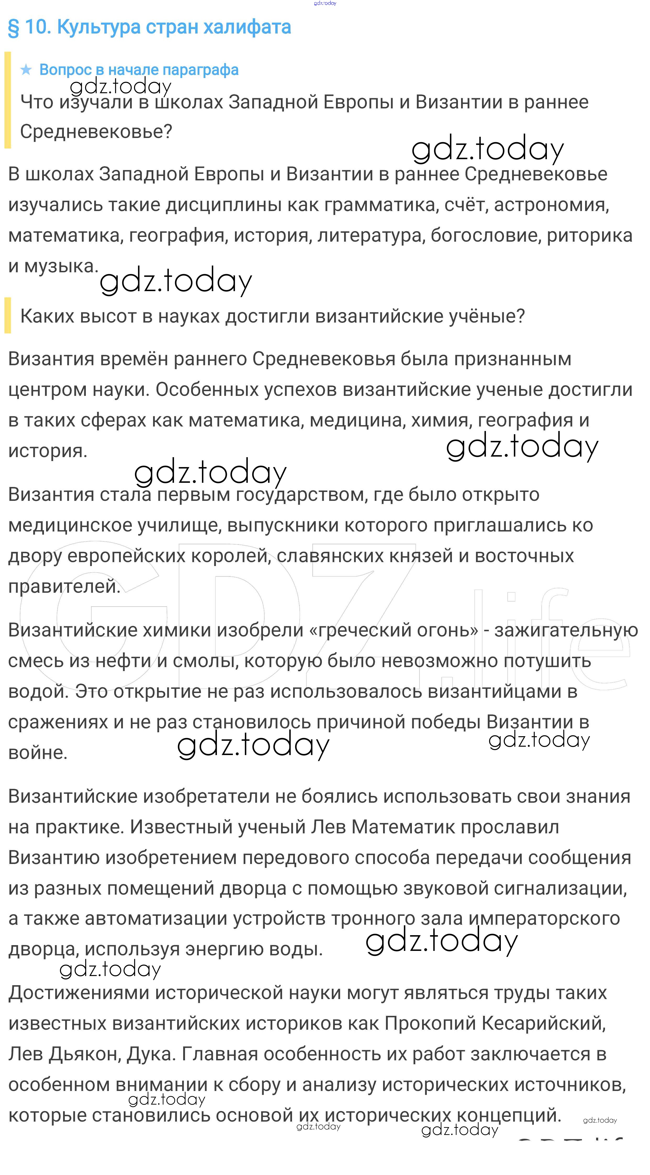 На страницах сайта gdz.today вы найдете учебный и вспомогательный материал, направленный на улучшения знаний школьной программы. ГДЗ - онлайн мир знаний Вопросы в начале параграфа § 10. Культура стран халифата 1 Учебнику по Всеобщей истории для 6 класса Агибалова, Донской Просвещение 2014