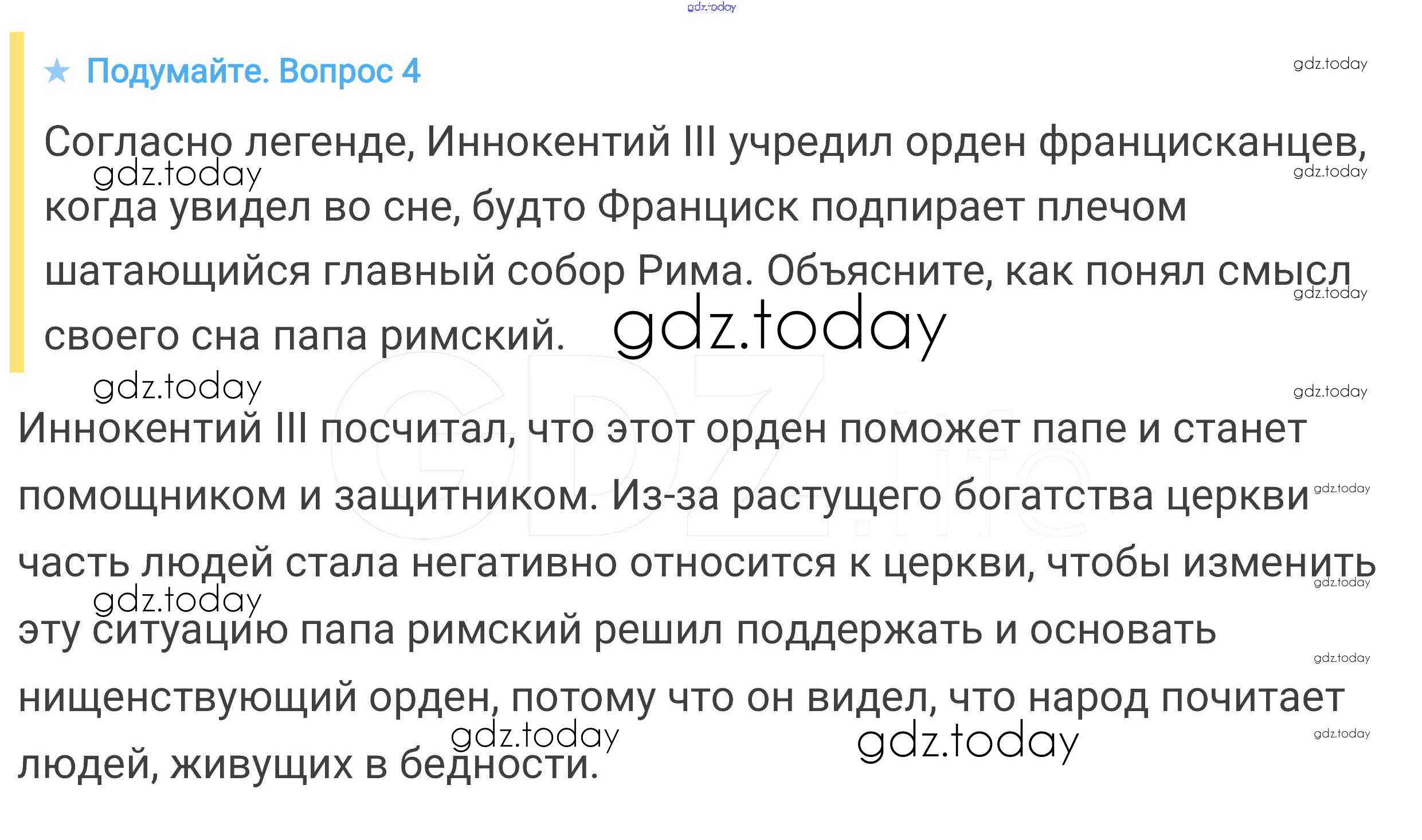 На страницах сайта gdz.today вы найдете учебный и вспомогательный материал, направленный на улучшения знаний школьной программы. ГДЗ - онлайн мир знаний Подумайте § 16. Могущество папской власти. Католическая церковь и еретики 4 Учебнику по Всеобщей истории для 6 класса Агибалова, Донской Просвещение 2014