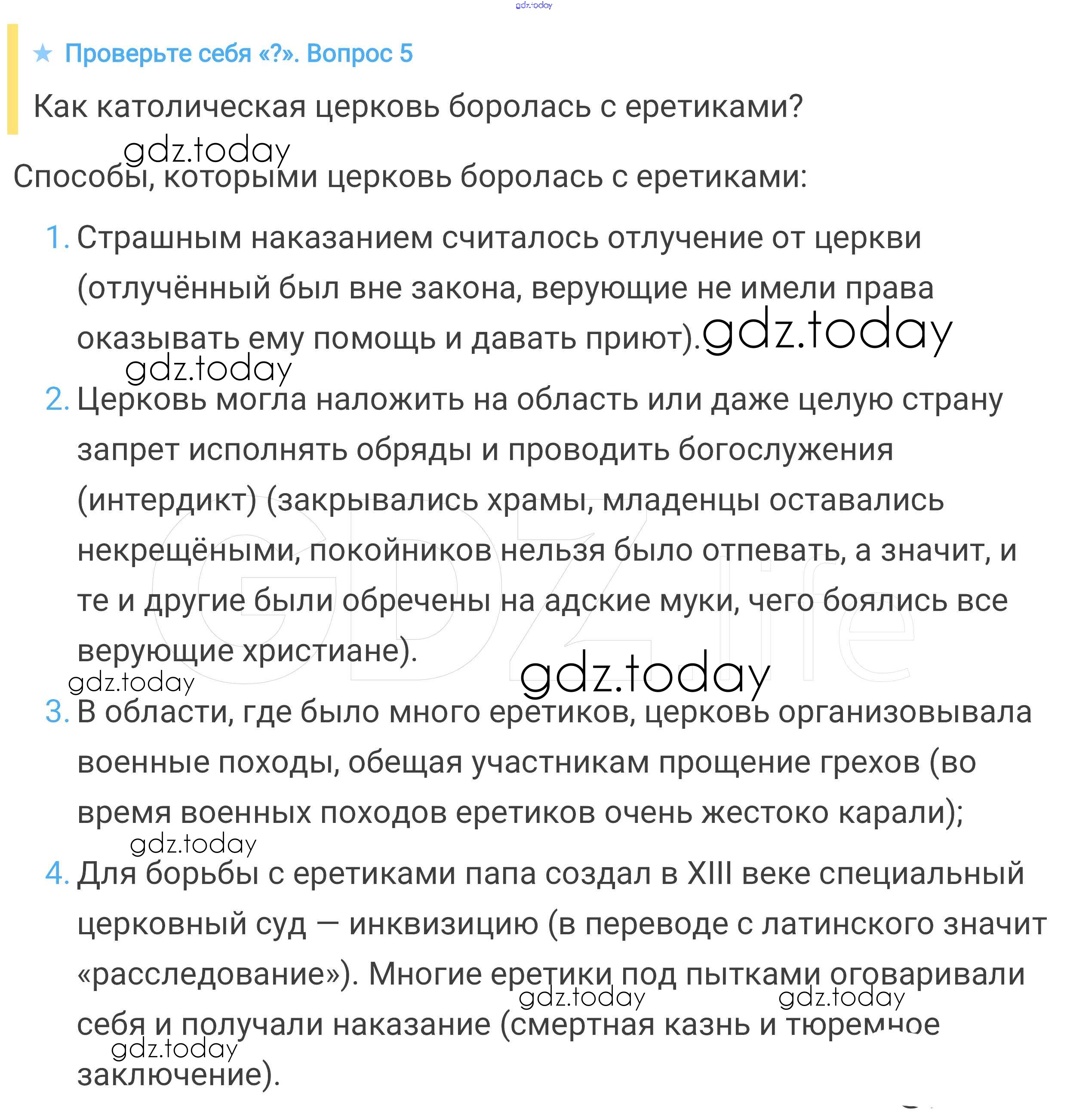 На страницах сайта gdz.today вы найдете учебный и вспомогательный материал, направленный на улучшения знаний школьной программы. ГДЗ - онлайн мир знаний Проверьте себя § 16. Могущество папской власти. Католическая церковь и еретики 5 Учебнику по Всеобщей истории для 6 класса Агибалова, Донской Просвещение 2014