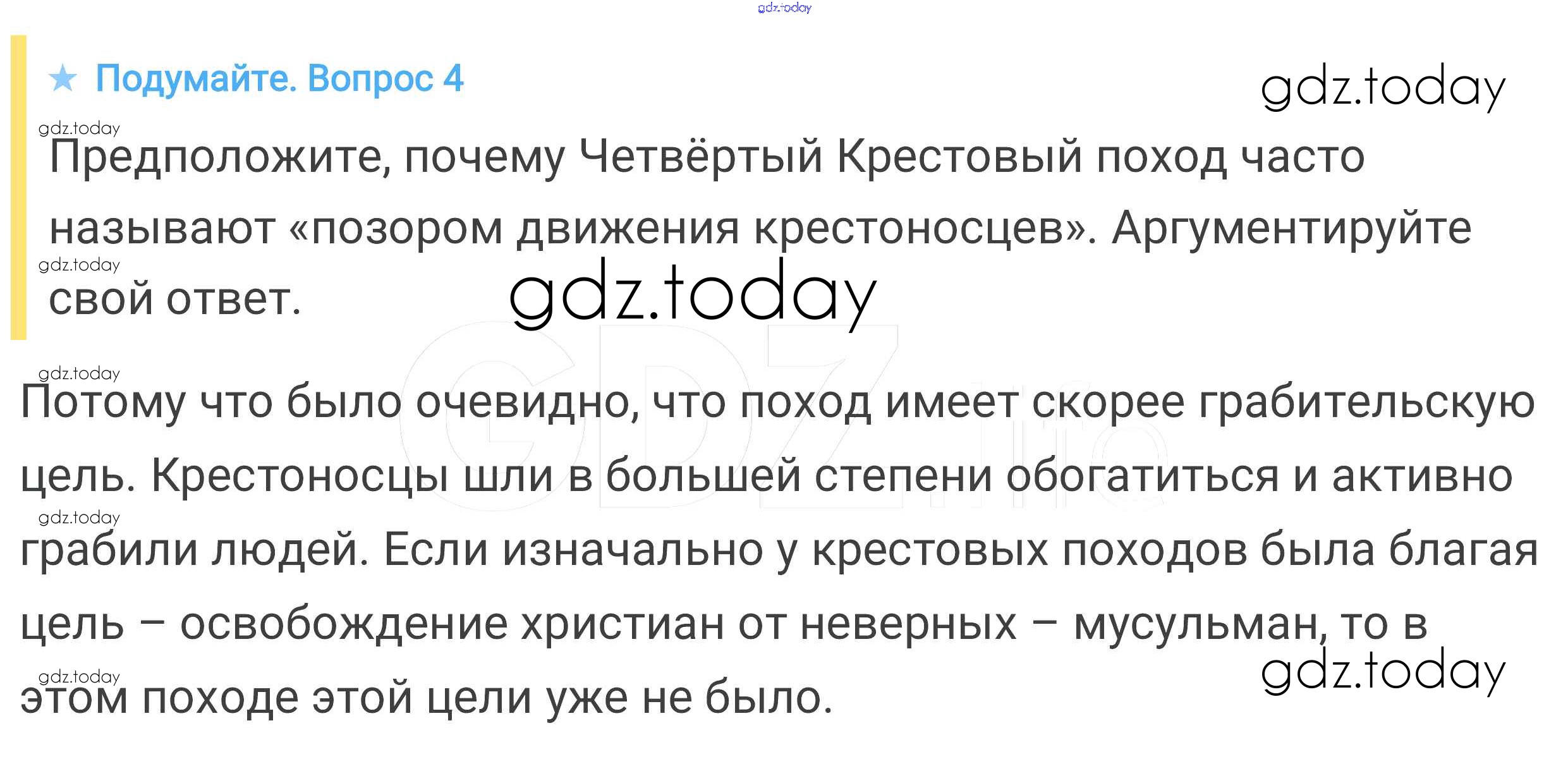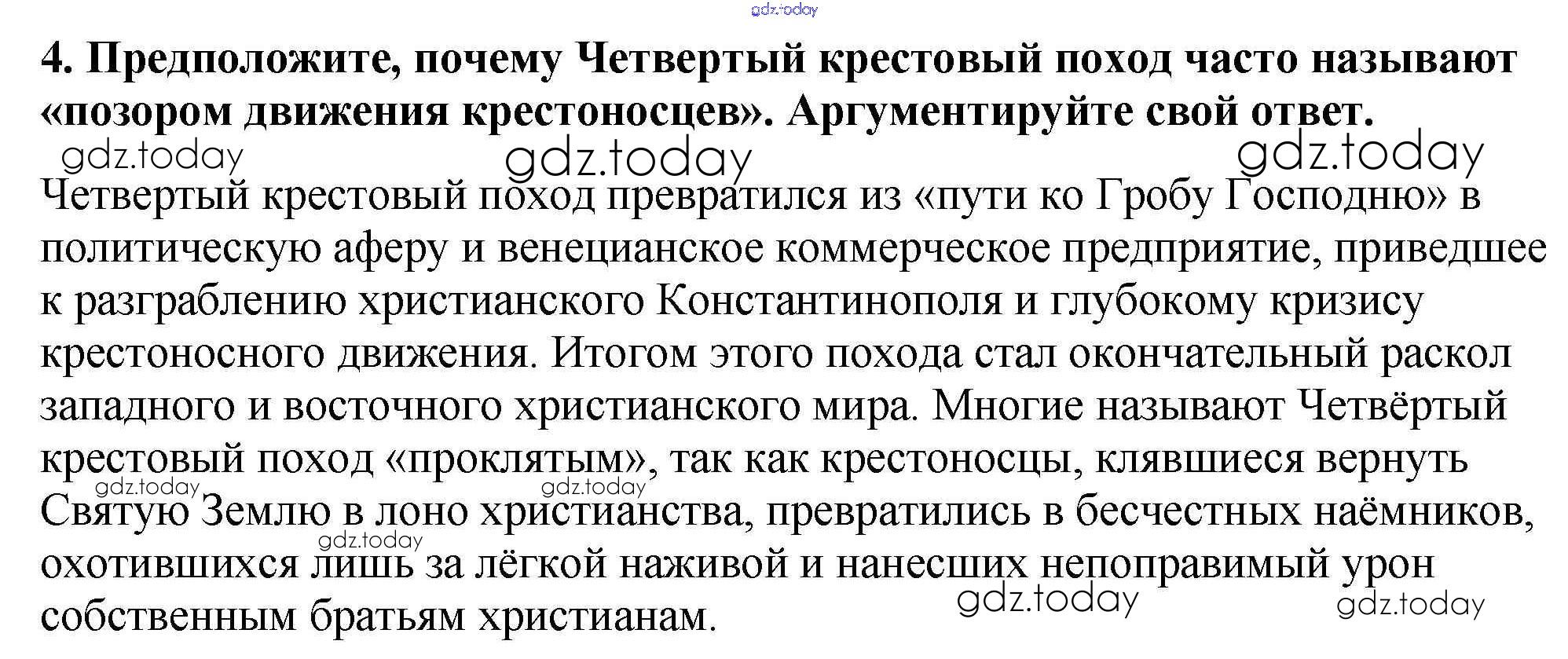 На страницах сайта gdz.today вы найдете учебный и вспомогательный материал, направленный на улучшения знаний школьной программы. ГДЗ - онлайн мир знаний Подумайте § 17. Крестовые походы 4 Учебнику по Всеобщей истории для 6 класса Агибалова, Донской Просвещение 2014