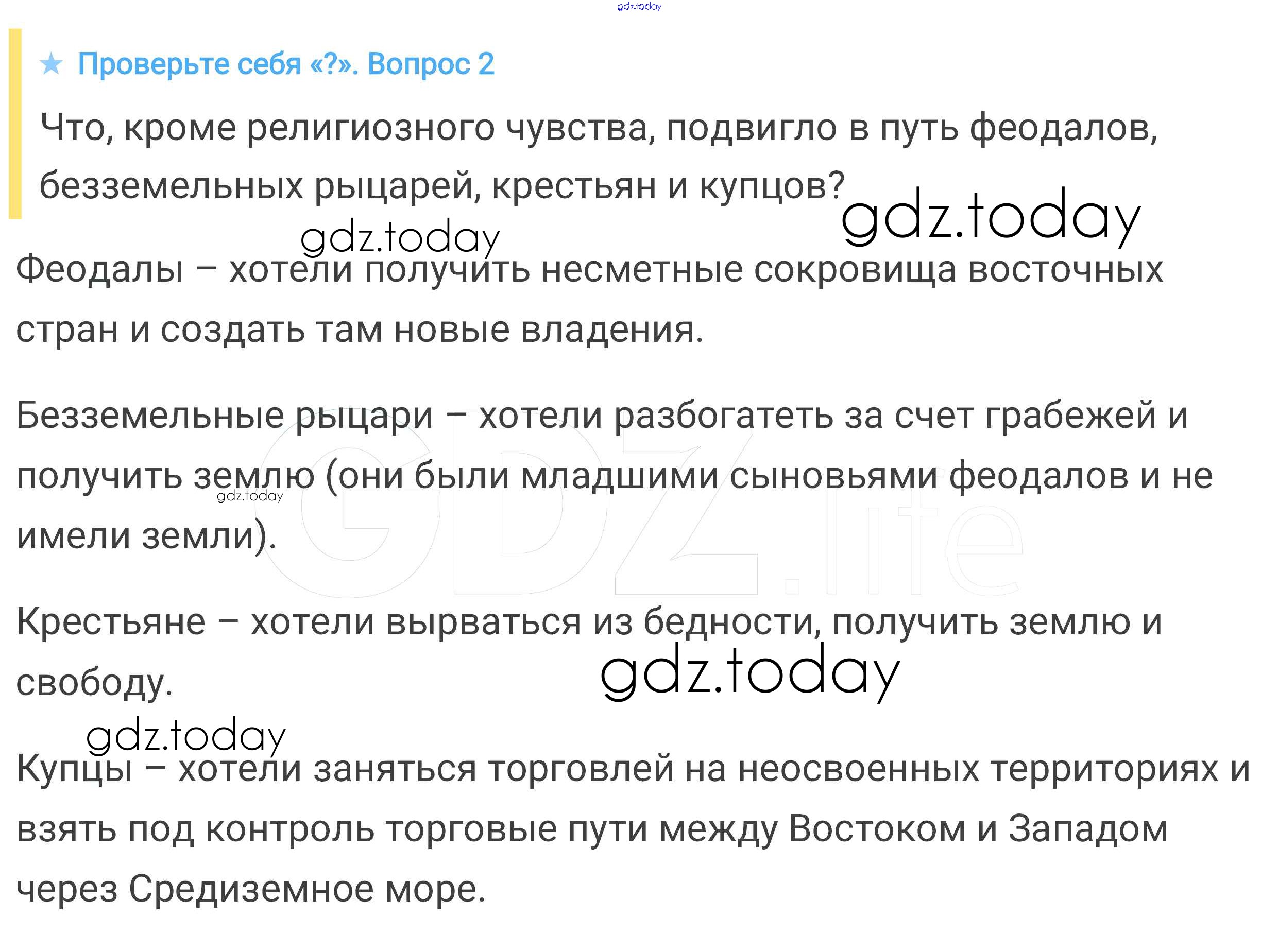 На страницах сайта gdz.today вы найдете учебный и вспомогательный материал, направленный на улучшения знаний школьной программы. ГДЗ - онлайн мир знаний Проверьте себя § 17. Крестовые походы 2 Учебнику по Всеобщей истории для 6 класса Агибалова, Донской Просвещение 2014