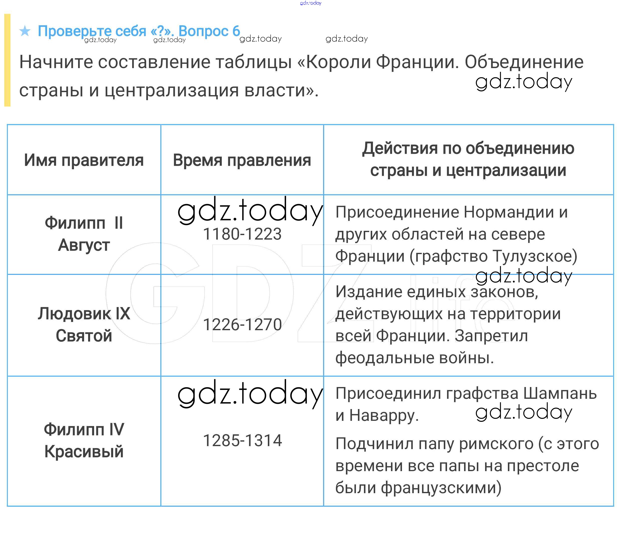На страницах сайта gdz.today вы найдете учебный и вспомогательный материал, направленный на улучшения знаний школьной программы. ГДЗ - онлайн мир знаний Проверьте себя § 18. Как происходило объединение Франции 6 Учебнику по Всеобщей истории для 6 класса Агибалова, Донской Просвещение 2014