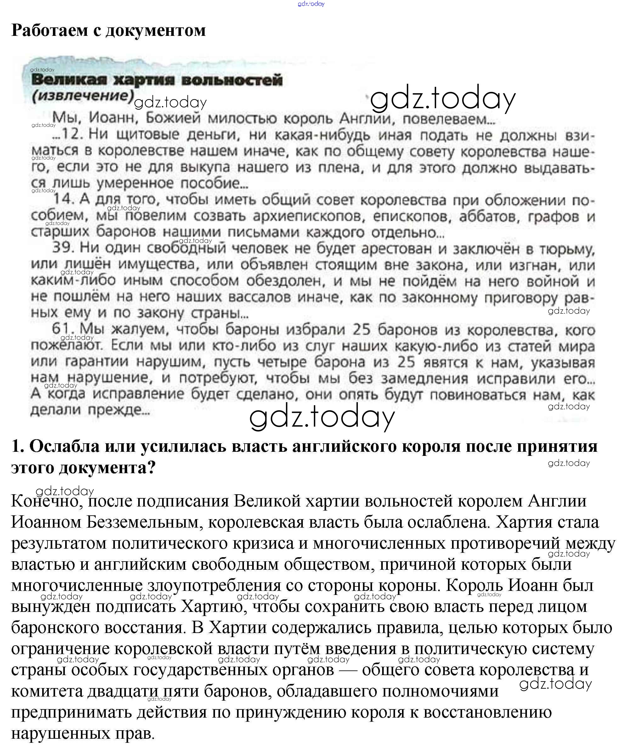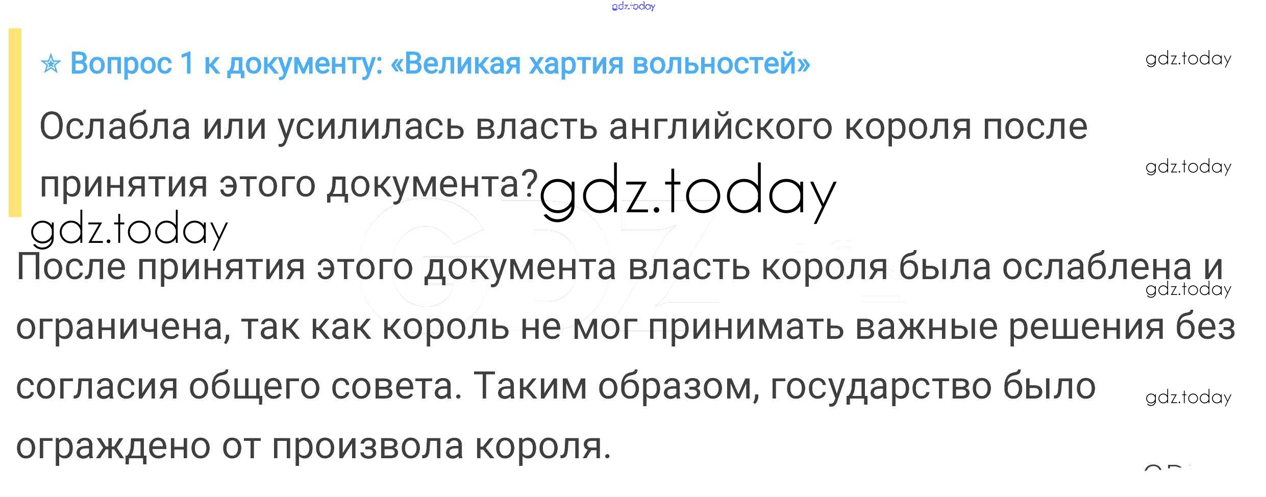На страницах сайта gdz.today вы найдете учебный и вспомогательный материал, направленный на улучшения знаний школьной программы. ГДЗ - онлайн мир знаний Вопросы к документу § 19. Что англичане считают началом своих свобод 1 Учебнику по Всеобщей истории для 6 класса Агибалова, Донской Просвещение 2014