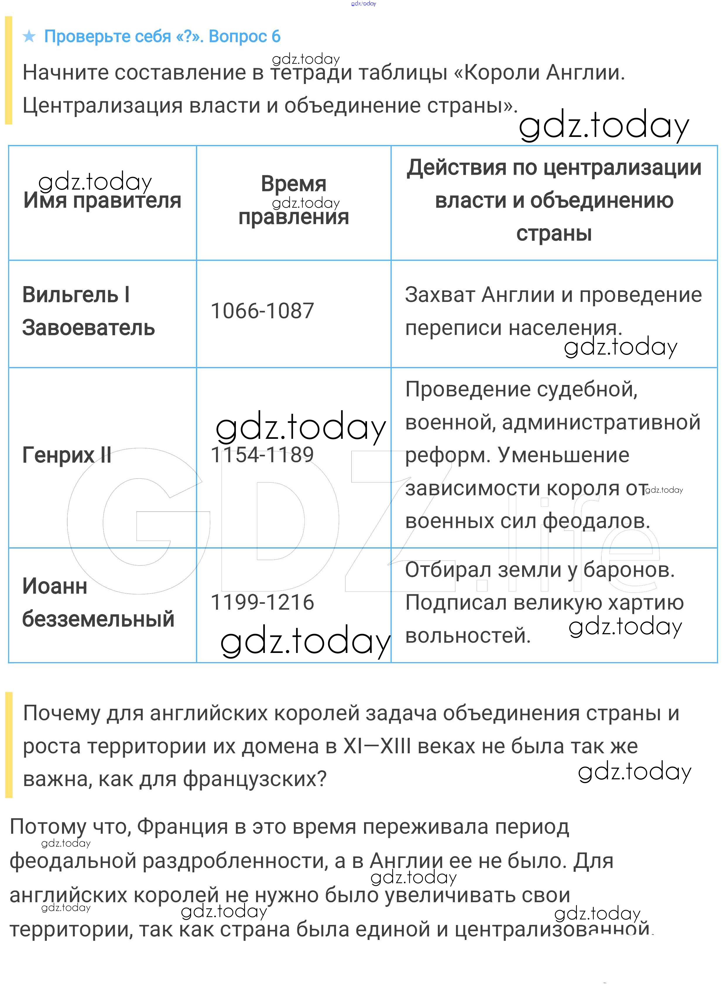На страницах сайта gdz.today вы найдете учебный и вспомогательный материал, направленный на улучшения знаний школьной программы. ГДЗ - онлайн мир знаний Проверьте себя § 19. Что англичане считают началом своих свобод 6 Учебнику по Всеобщей истории для 6 класса Агибалова, Донской Просвещение 2014