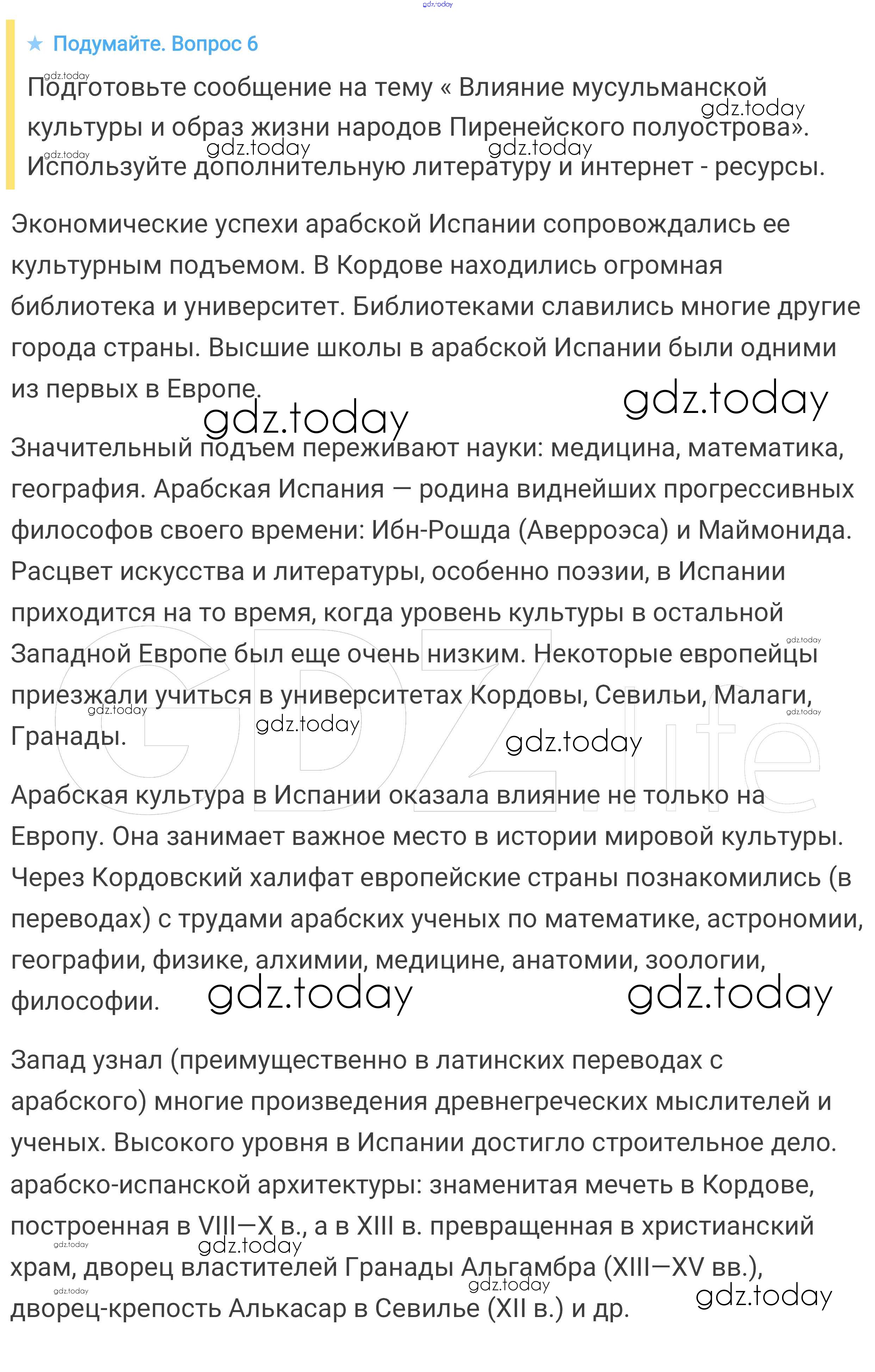 На страницах сайта gdz.today вы найдете учебный и вспомогательный материал, направленный на улучшения знаний школьной программы. ГДЗ - онлайн мир знаний Подумайте § 22. Реконкиста и образование централизованных государств на Пиренейском полуострове 6 Учебнику по Всеобщей истории для 6 класса Агибалова, Донской Просвещение 2014