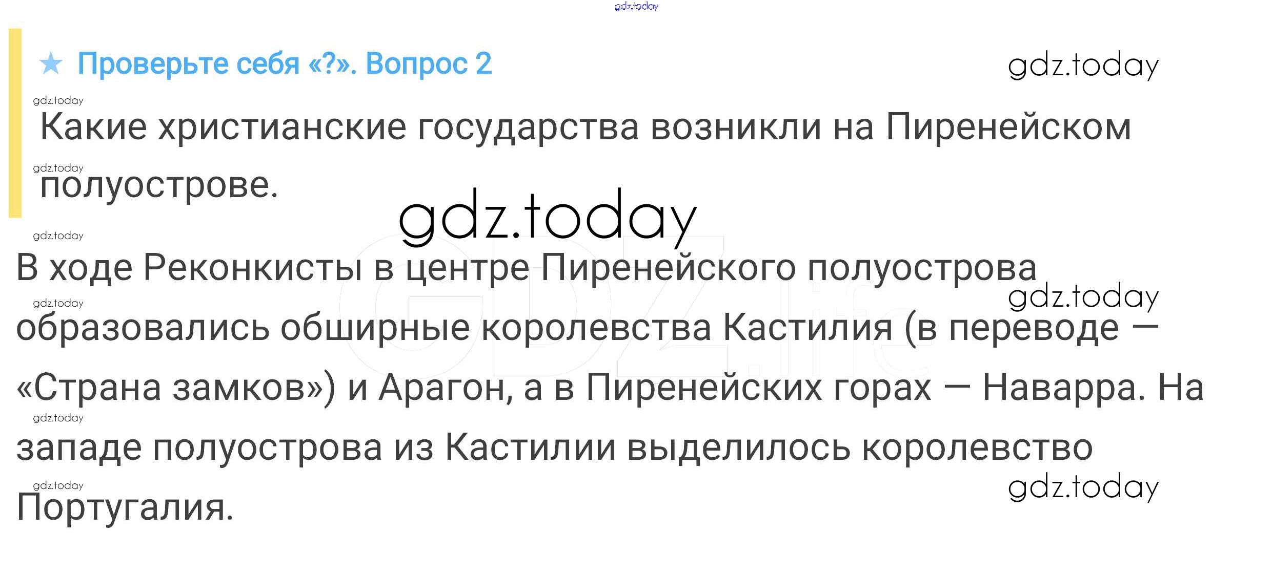 На страницах сайта gdz.today вы найдете учебный и вспомогательный материал, направленный на улучшения знаний школьной программы. ГДЗ - онлайн мир знаний Проверьте себя § 22. Реконкиста и образование централизованных государств на Пиренейском полуострове 2 Учебнику по Всеобщей истории для 6 класса Агибалова, Донской Просвещение 2014