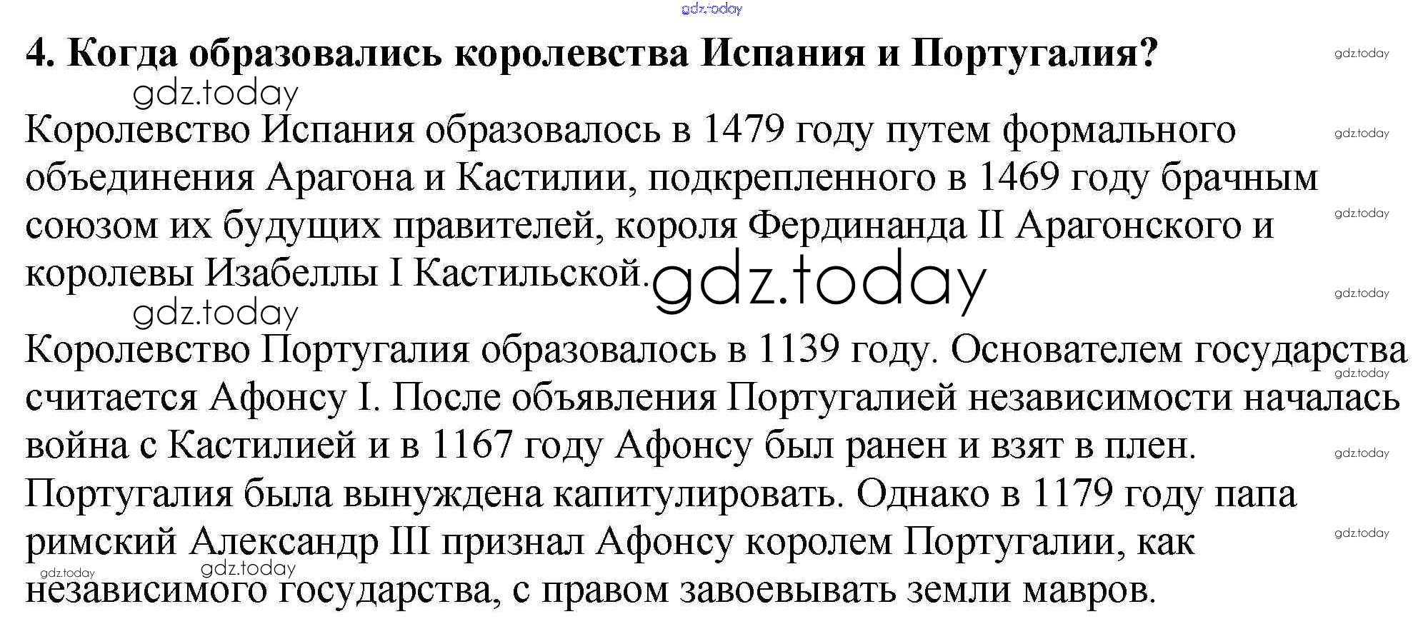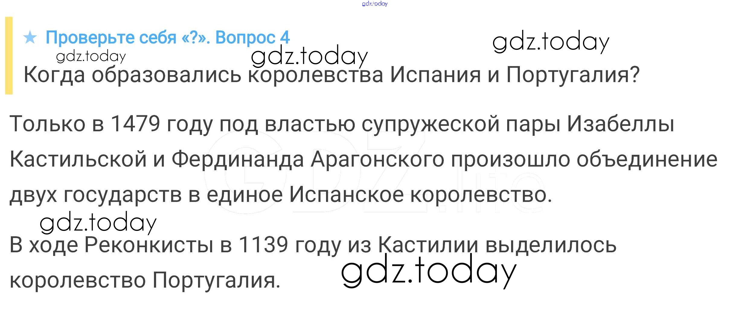 На страницах сайта gdz.today вы найдете учебный и вспомогательный материал, направленный на улучшения знаний школьной программы. ГДЗ - онлайн мир знаний Проверьте себя § 22. Реконкиста и образование централизованных государств на Пиренейском полуострове 4 Учебнику по Всеобщей истории для 6 класса Агибалова, Донской Просвещение 2014
