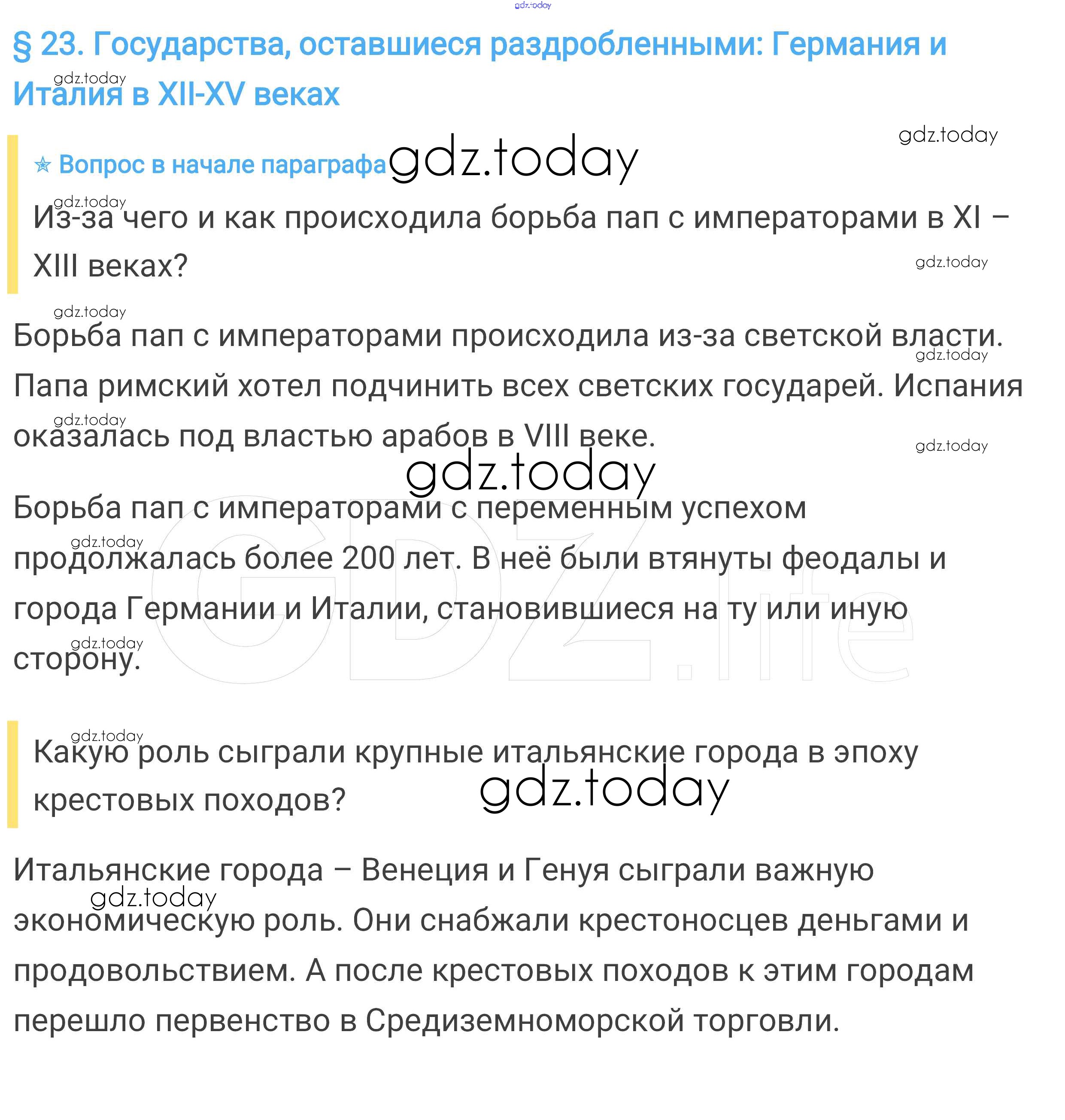 На страницах сайта gdz.today вы найдете учебный и вспомогательный материал, направленный на улучшения знаний школьной программы. ГДЗ - онлайн мир знаний Вопросы в начале параграфа § 23. Государства, оставшиеся раздробленными: Германия и Италия в XII—XV веках 1 Учебнику по Всеобщей истории для 6 класса Агибалова, Донской Просвещение 2014