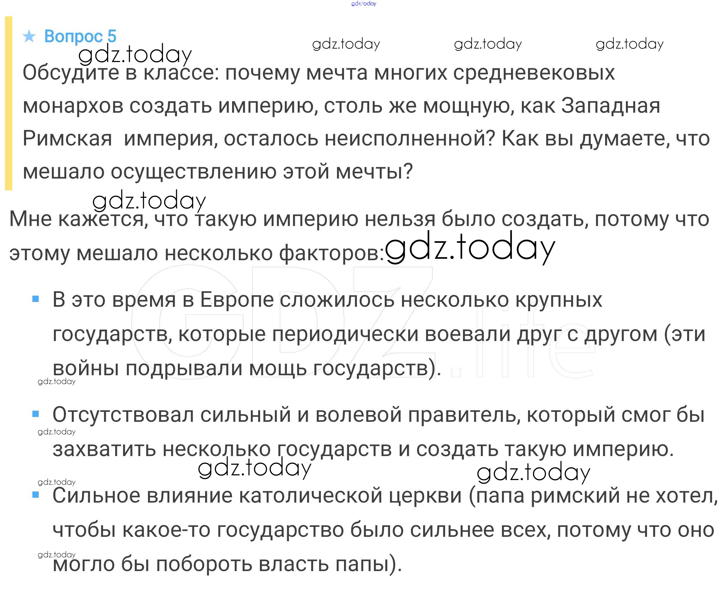 На страницах сайта gdz.today вы найдете учебный и вспомогательный материал, направленный на улучшения знаний школьной программы. ГДЗ - онлайн мир знаний Вопросы и задания к главе Решение к главе 7 5 Учебнику по Всеобщей истории для 6 класса Агибалова, Донской Просвещение 2014