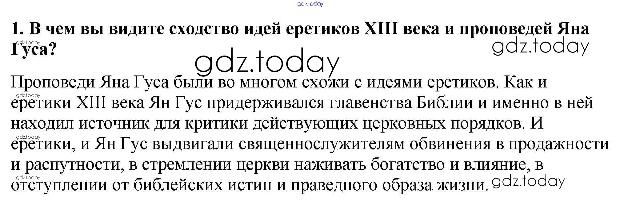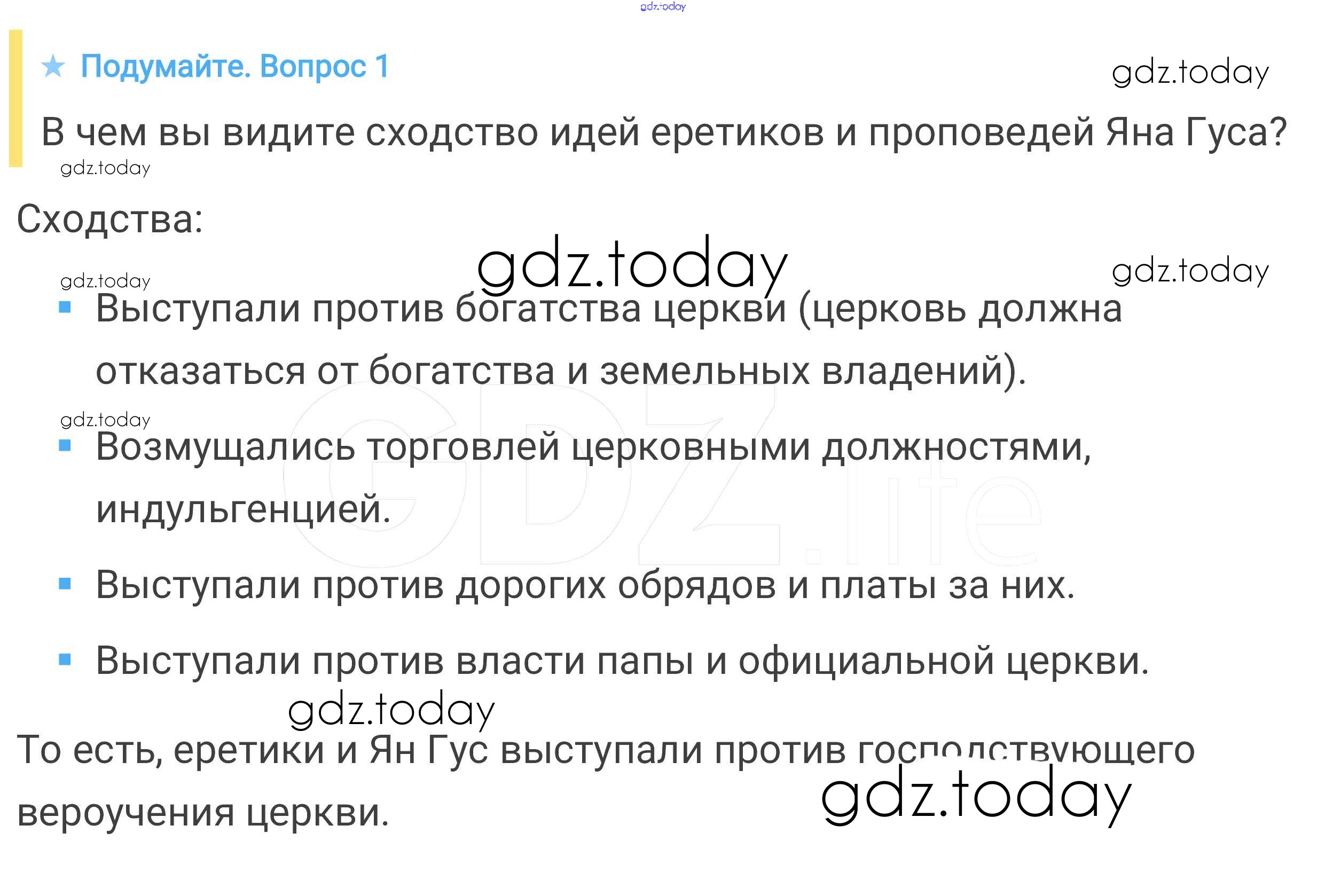 На страницах сайта gdz.today вы найдете учебный и вспомогательный материал, направленный на улучшения знаний школьной программы. ГДЗ - онлайн мир знаний Подумайте § 24. Гуситское движение в Чехии 1 Учебнику по Всеобщей истории для 6 класса Агибалова, Донской Просвещение 2014