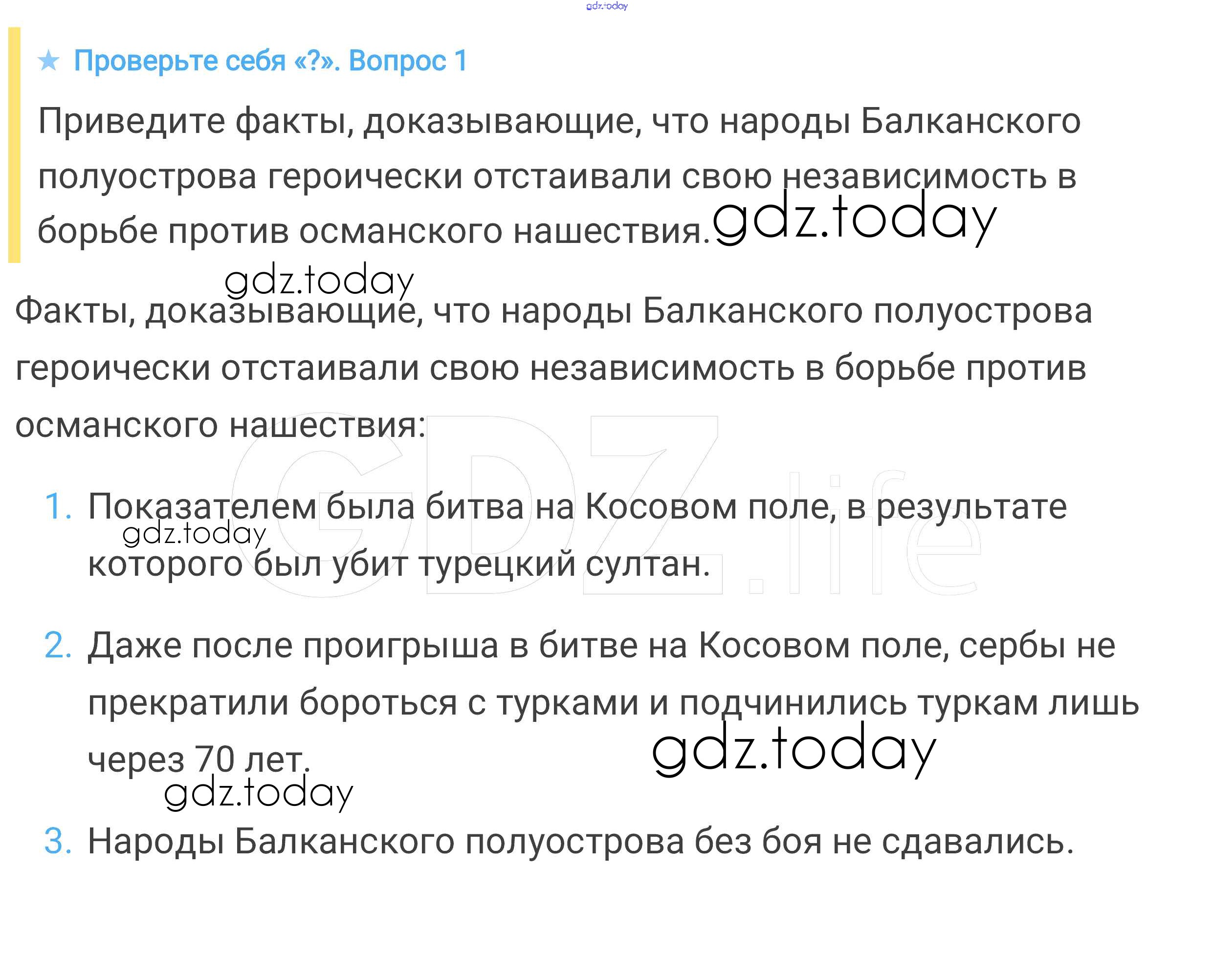 На страницах сайта gdz.today вы найдете учебный и вспомогательный материал, направленный на улучшения знаний школьной программы. ГДЗ - онлайн мир знаний Проверьте себя § 25. Завоевание турками-османами Балканского полуострова 1 Учебнику по Всеобщей истории для 6 класса Агибалова, Донской Просвещение 2014