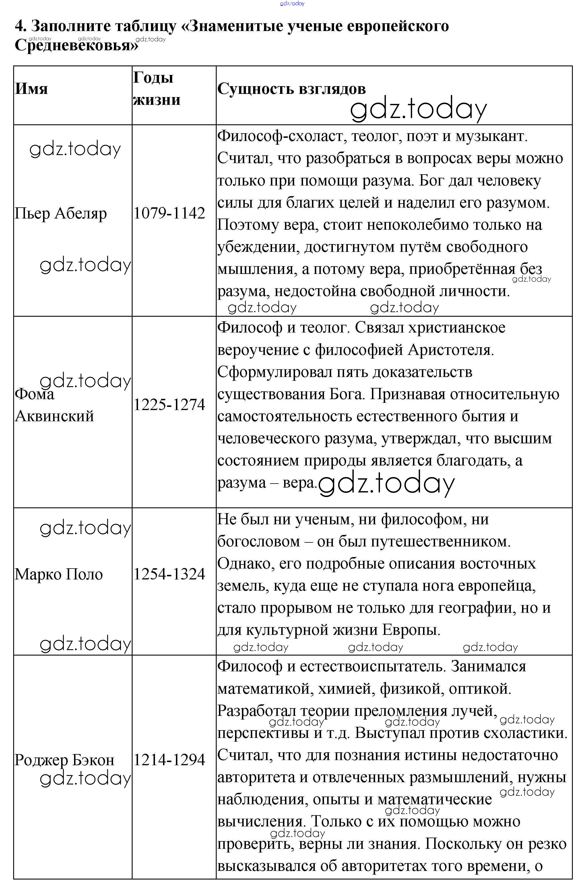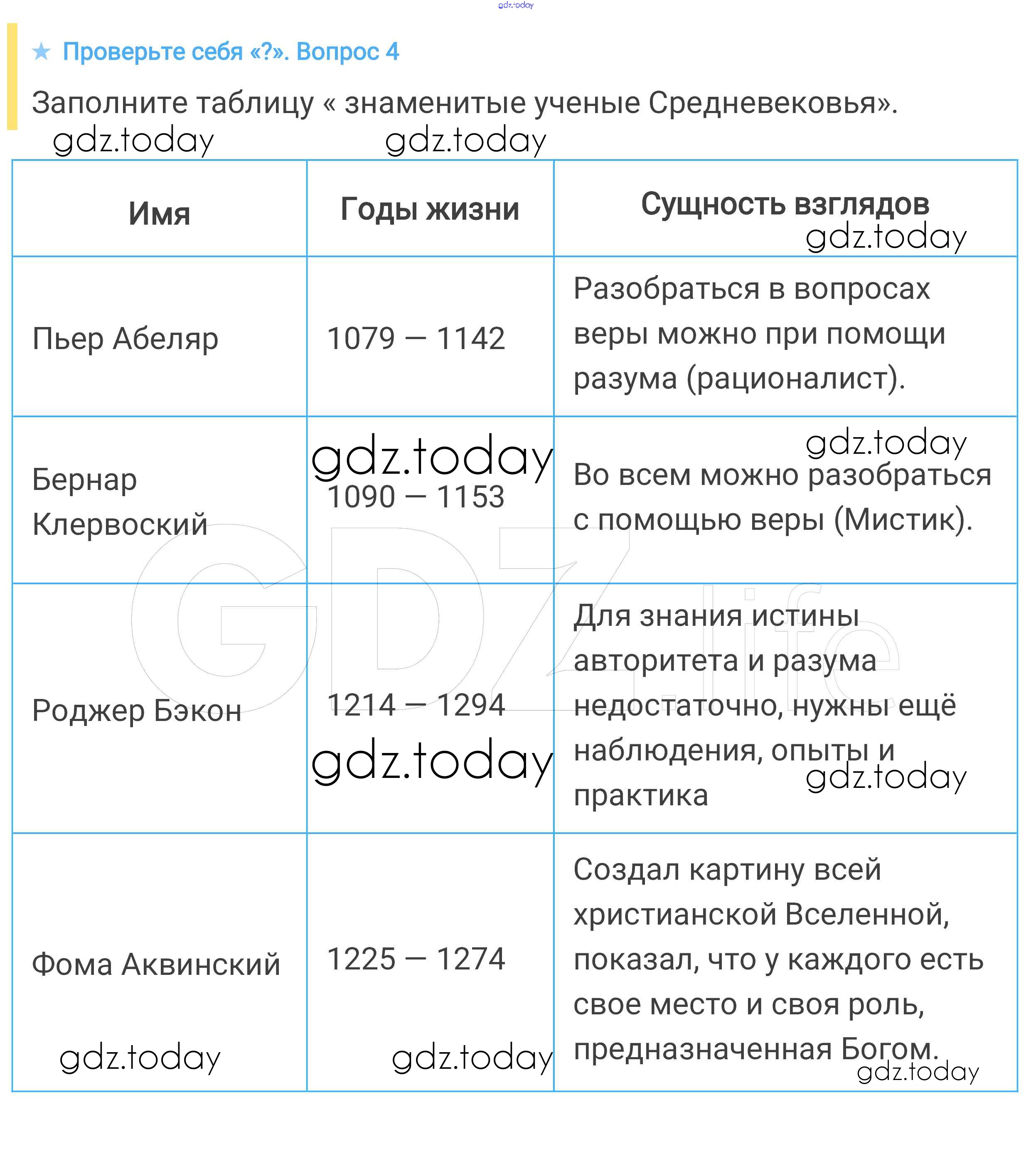 На страницах сайта gdz.today вы найдете учебный и вспомогательный материал, направленный на улучшения знаний школьной программы. ГДЗ - онлайн мир знаний Проверьте себя § 26. Образование и философия 4 Учебнику по Всеобщей истории для 6 класса Агибалова, Донской Просвещение 2014
