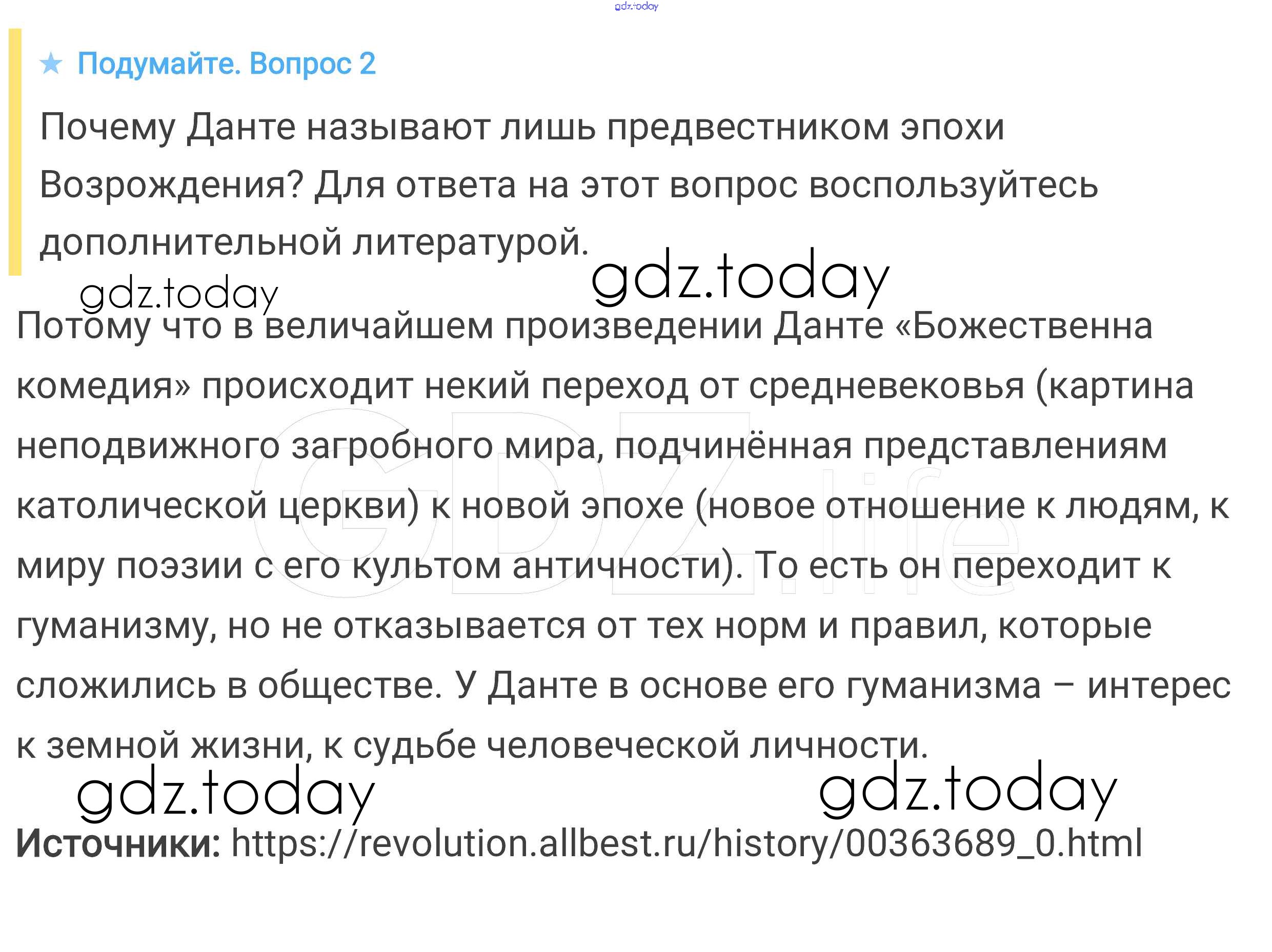 На страницах сайта gdz.today вы найдете учебный и вспомогательный материал, направленный на улучшения знаний школьной программы. ГДЗ - онлайн мир знаний Подумайте § 29. Культура раннего Возрождения в Италии 2 Учебнику по Всеобщей истории для 6 класса Агибалова, Донской Просвещение 2014