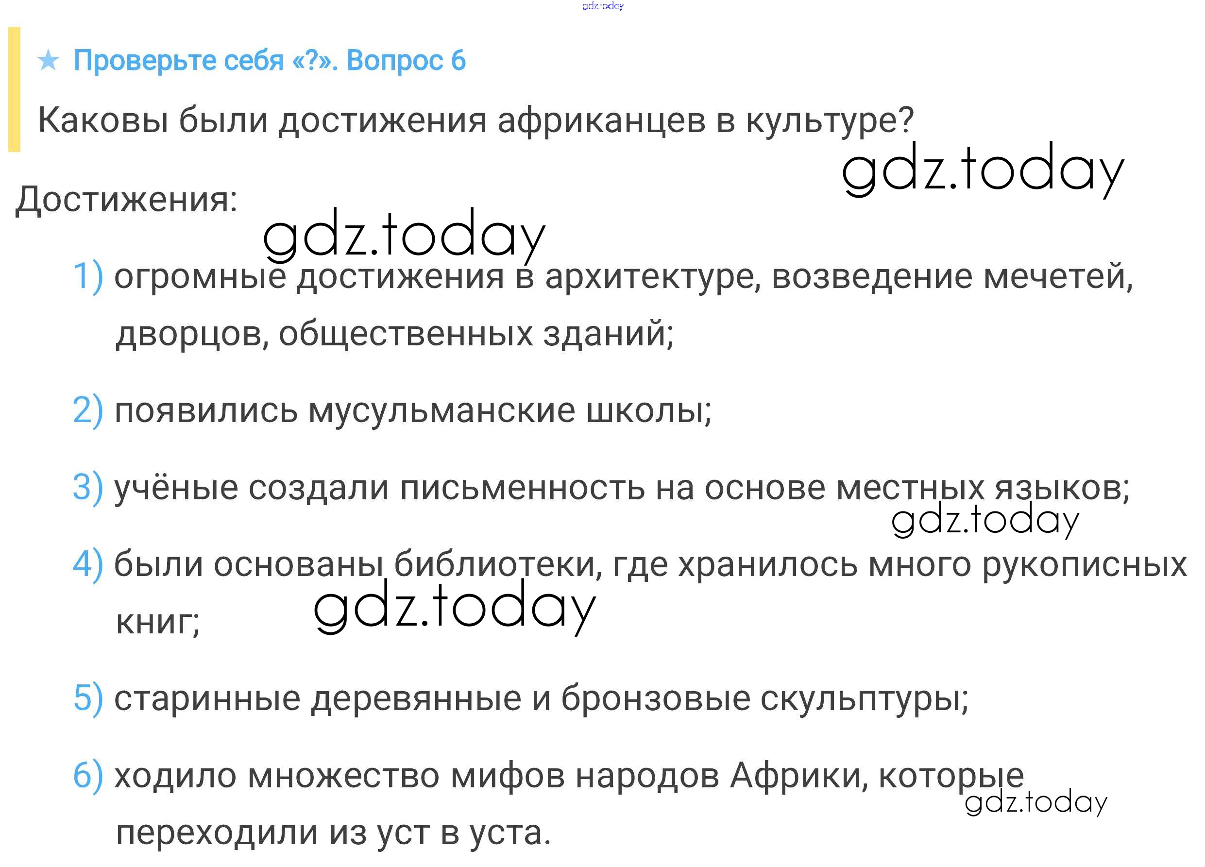 На страницах сайта gdz.today вы найдете учебный и вспомогательный материал, направленный на улучшения знаний школьной программы. ГДЗ - онлайн мир знаний Проверьте себя § 32. Государства и народы Африки и доколумбовой Америки 6 Учебнику по Всеобщей истории для 6 класса Агибалова, Донской Просвещение 2014