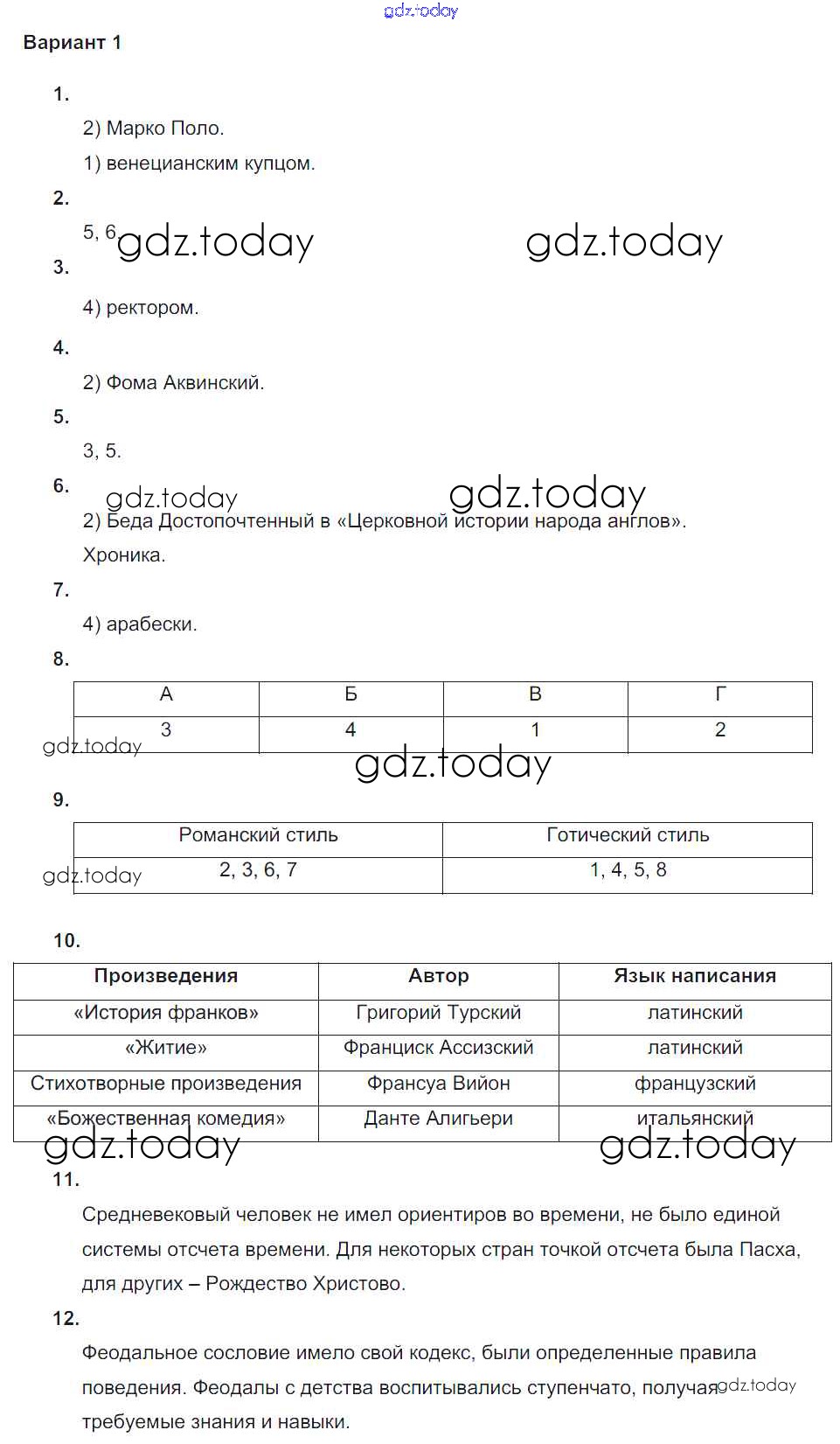 Ответы к ПР №1 Решение к главе 9 вариант-1 Проверочным и контрольным работам по Всеобщей истории для 6 класса Крючкова Просвещение 2014