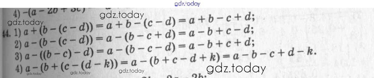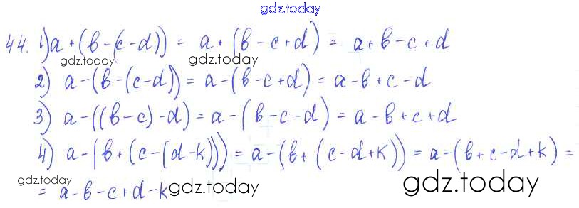 На страницах сайта gdz.today вы найдете учебный и вспомогательный материал, направленный на улучшения знаний школьной программы. ГДЗ - онлайн мир знаний §5. Правила раскрытия скобок Решение к главе 1. Алгебраические выражения 44 Учебнику по Алгебре для 7 класса Колягин, Ткачёва Просвещение 2014