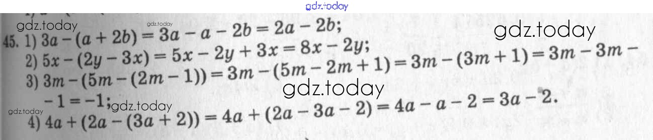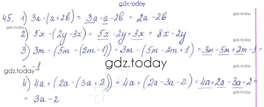 На страницах сайта gdz.today вы найдете учебный и вспомогательный материал, направленный на улучшения знаний школьной программы. ГДЗ - онлайн мир знаний §5. Правила раскрытия скобок Решение к главе 1. Алгебраические выражения 45 Учебнику по Алгебре для 7 класса Колягин, Ткачёва Просвещение 2014