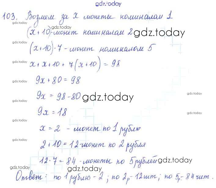 На страницах сайта gdz.today вы найдете учебный и вспомогательный материал, направленный на улучшения знаний школьной программы. ГДЗ - онлайн мир знаний §8. Решение задач с помощью уравнений Решение к главе 2. Уравнения с одним неизвестным 103 Учебнику по Алгебре для 7 класса Колягин, Ткачёва Просвещение 2014