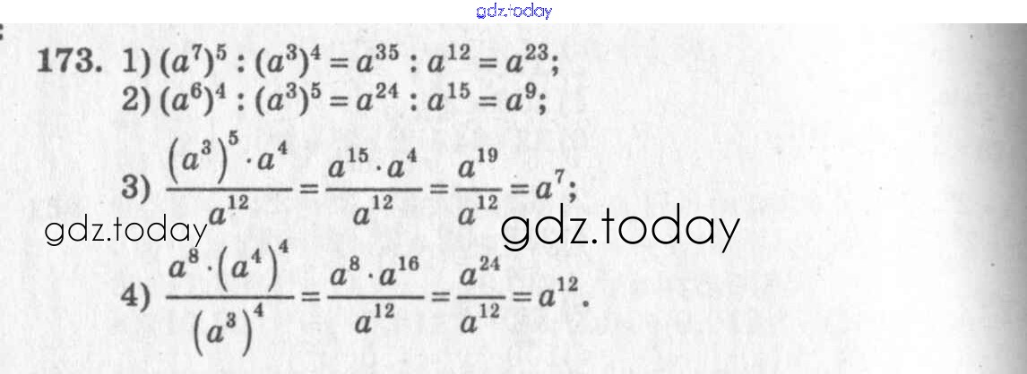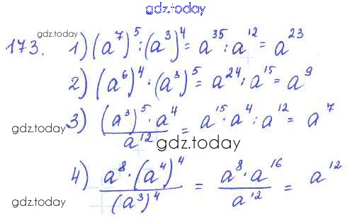 На страницах сайта gdz.today вы найдете учебный и вспомогательный материал, направленный на улучшения знаний школьной программы. ГДЗ - онлайн мир знаний §10. Свойства степени с натуральным показателем Решение к главе 3. Одночлены и многочлены 173 Учебнику по Алгебре для 7 класса Колягин, Ткачёва Просвещение 2014