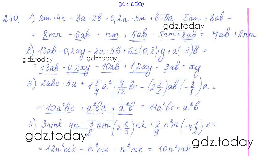 На страницах сайта gdz.today вы найдете учебный и вспомогательный материал, направленный на улучшения знаний школьной программы. ГДЗ - онлайн мир знаний §14. Приведение подобных членов Решение к главе 3. Одночлены и многочлены 240 Учебнику по Алгебре для 7 класса Колягин, Ткачёва Просвещение 2014