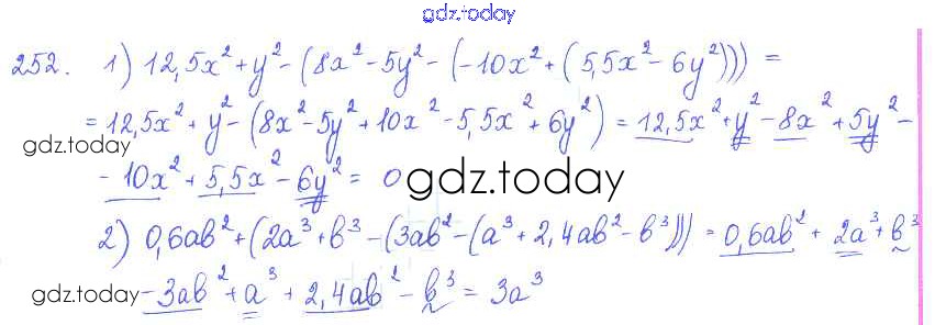 На страницах сайта gdz.today вы найдете учебный и вспомогательный материал, направленный на улучшения знаний школьной программы. ГДЗ - онлайн мир знаний §15. Сложение и вычитание многочленов Решение к главе 3. Одночлены и многочлены 252 Учебнику по Алгебре для 7 класса Колягин, Ткачёва Просвещение 2014