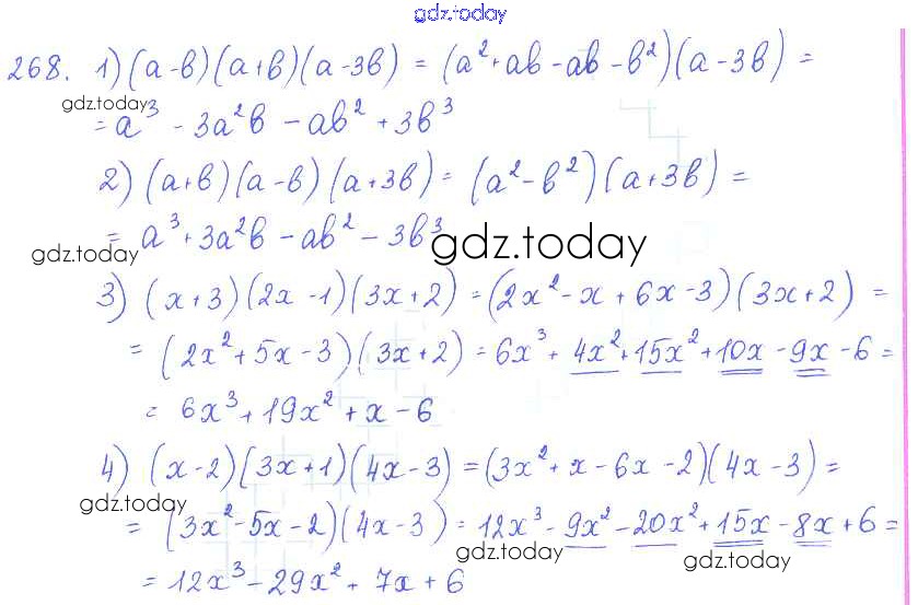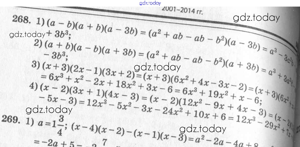 На страницах сайта gdz.today вы найдете учебный и вспомогательный материал, направленный на улучшения знаний школьной программы. ГДЗ - онлайн мир знаний §17. Умножение многочлена на многочлен Решение к главе 3. Одночлены и многочлены 268 Учебнику по Алгебре для 7 класса Колягин, Ткачёва Просвещение 2014
