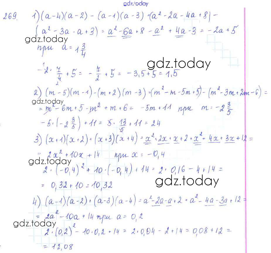 На страницах сайта gdz.today вы найдете учебный и вспомогательный материал, направленный на улучшения знаний школьной программы. ГДЗ - онлайн мир знаний §17. Умножение многочлена на многочлен Решение к главе 3. Одночлены и многочлены 269 Учебнику по Алгебре для 7 класса Колягин, Ткачёва Просвещение 2014