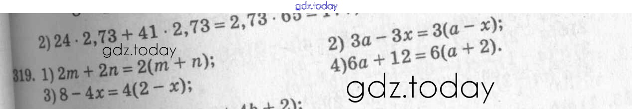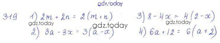 На страницах сайта gdz.today вы найдете учебный и вспомогательный материал, направленный на улучшения знаний школьной программы. ГДЗ - онлайн мир знаний §19. Вынесение общего множителя за скобки Решение к главе 4. Разложение многочленов на множители 319 Учебнику по Алгебре для 7 класса Колягин, Ткачёва Просвещение 2014